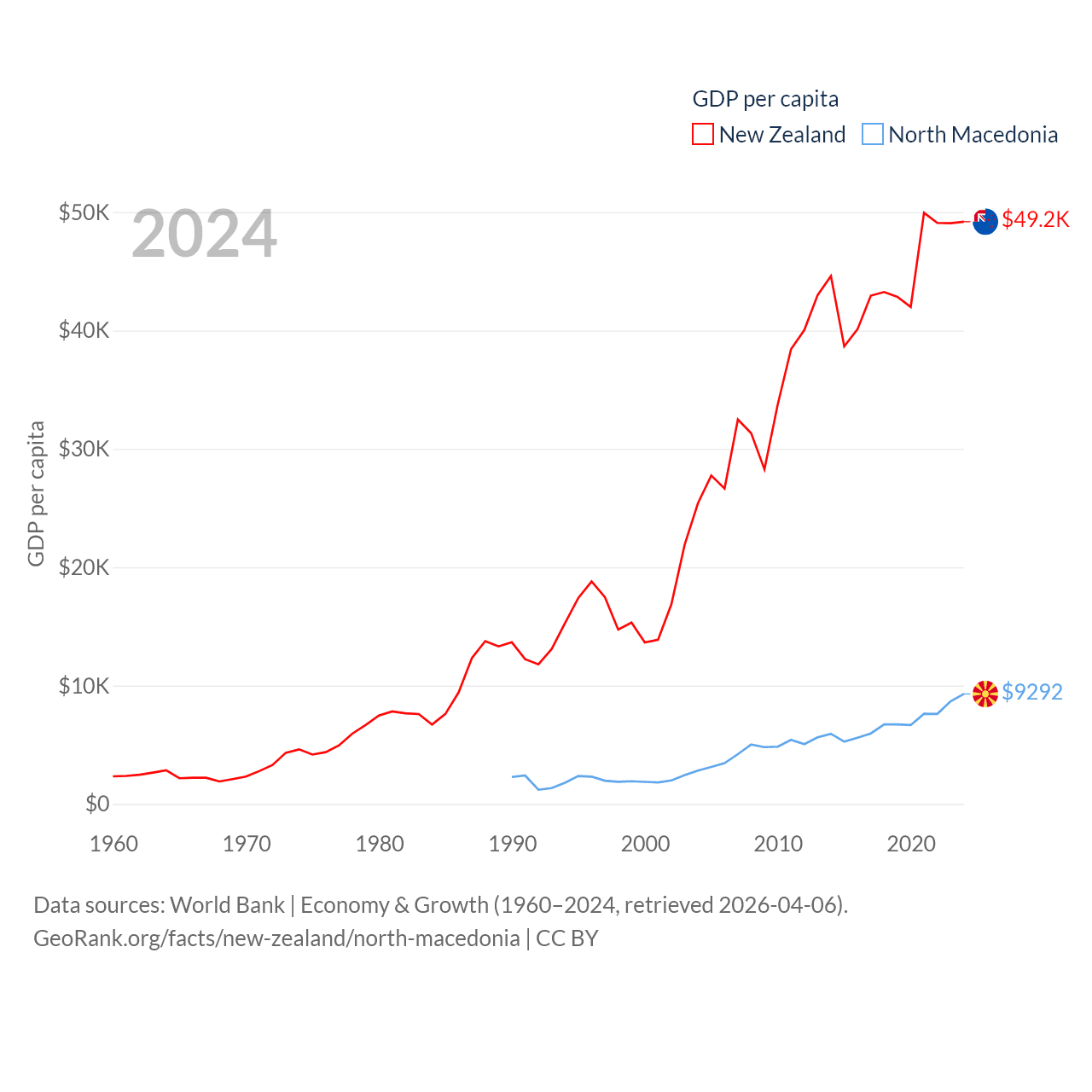 By GDP, New Zealand ranks 52/197 ($260B) and North Macedonia ranks 138/197 ($17B). By GDP per capita, New Zealand ranks 26/197 ($49,205), while North Macedonia ranks 88/197 ($9,292).