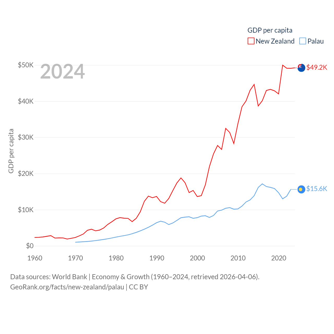 By GDP, New Zealand ranks 52/197 ($260B) and Palau ranks 194/197 ($277M). By GDP per capita, New Zealand ranks 26/197 ($49,205), while Palau ranks 67/197 ($15,611).
