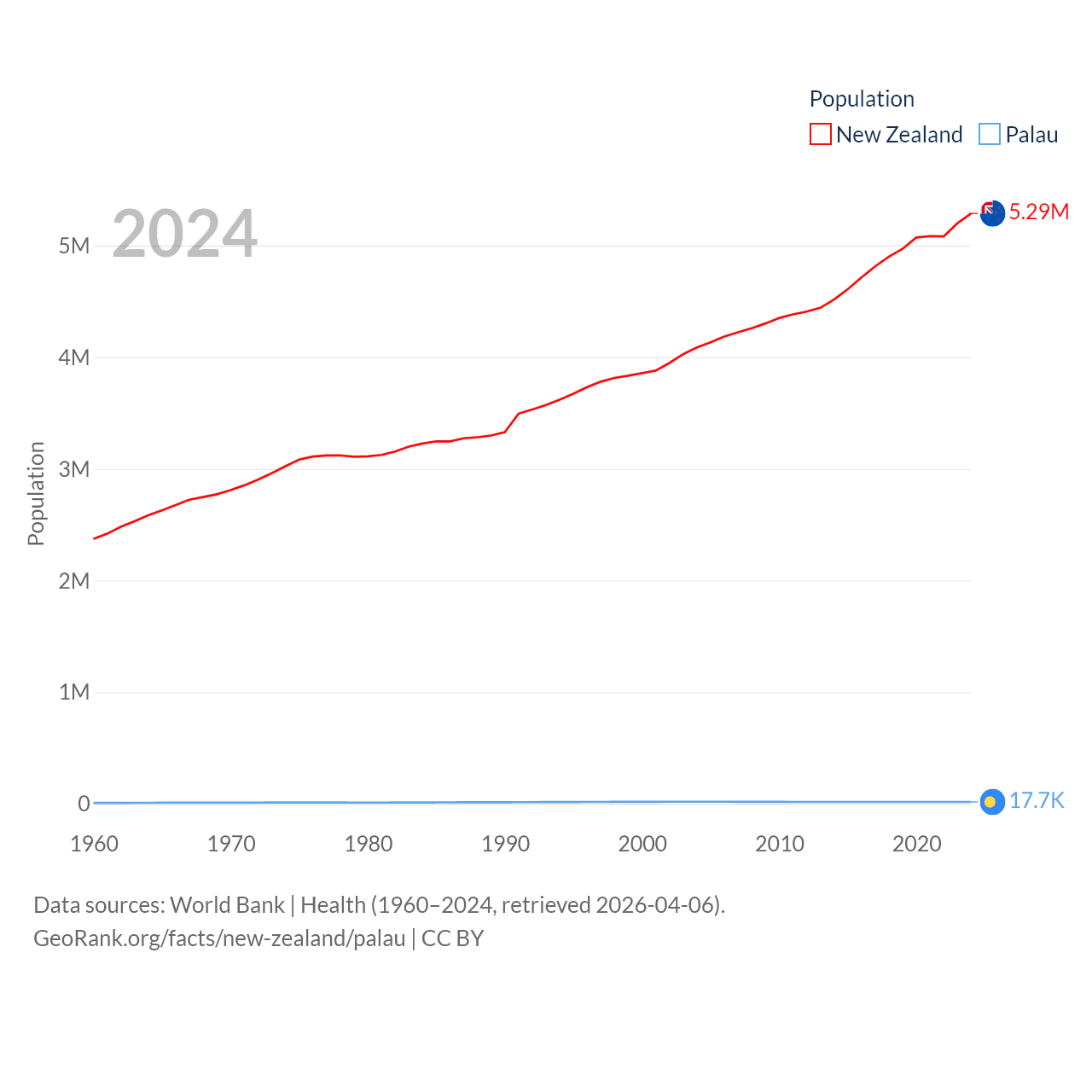 New Zealand has a population of 5.29M (ranked 123/197), compared with 17.7K in Palau (ranked 194/197). New Zealand's land area is 101,665 sq mi versus 177.6 sq mi for Palau (ranked 74th vs. 180th).