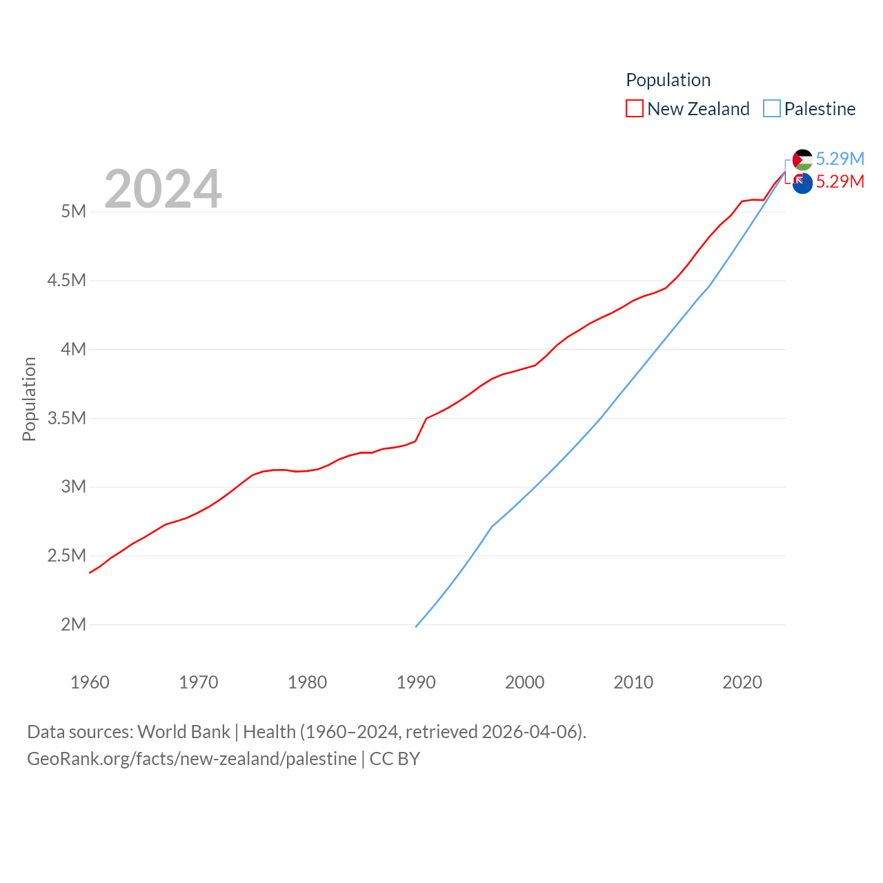 New Zealand has a population of 5.29M (ranked 123/197), compared with 5.29M in Palestine (ranked 122/197). New Zealand's land area is 101,665 sq mi versus 2,326 sq mi for Palestine (ranked 74th vs. 164th).