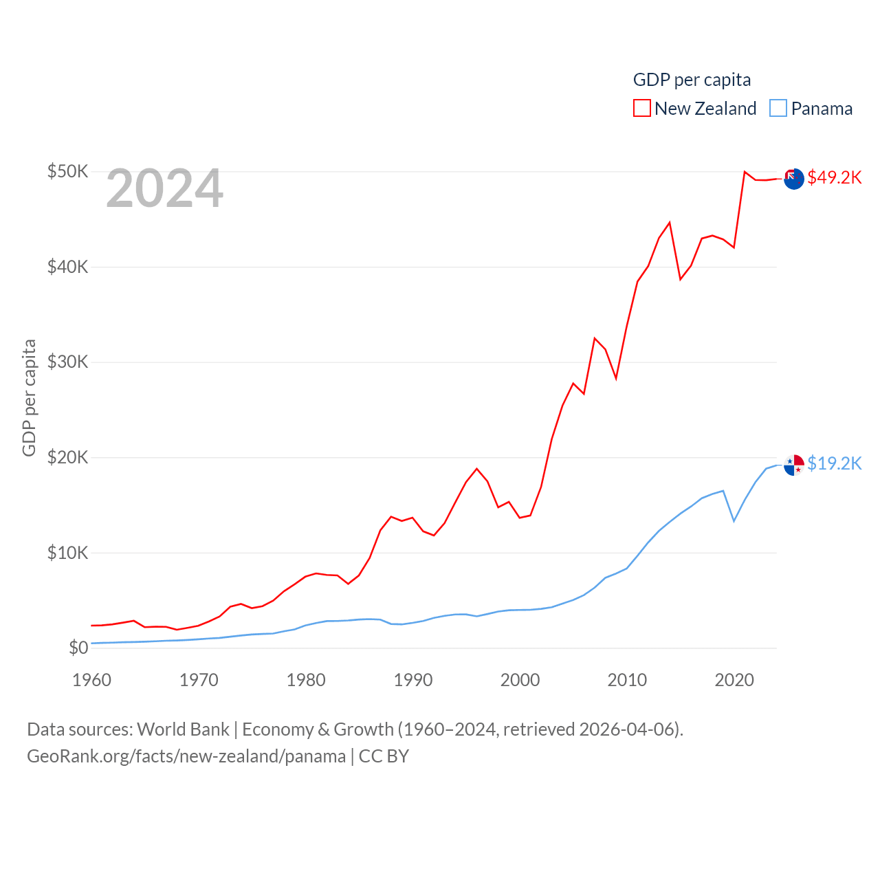 By GDP, New Zealand ranks 52/197 ($260B) and Panama ranks 78/197 ($86.5B). By GDP per capita, New Zealand ranks 26/197 ($49,205), while Panama ranks 60/197 ($19,161).