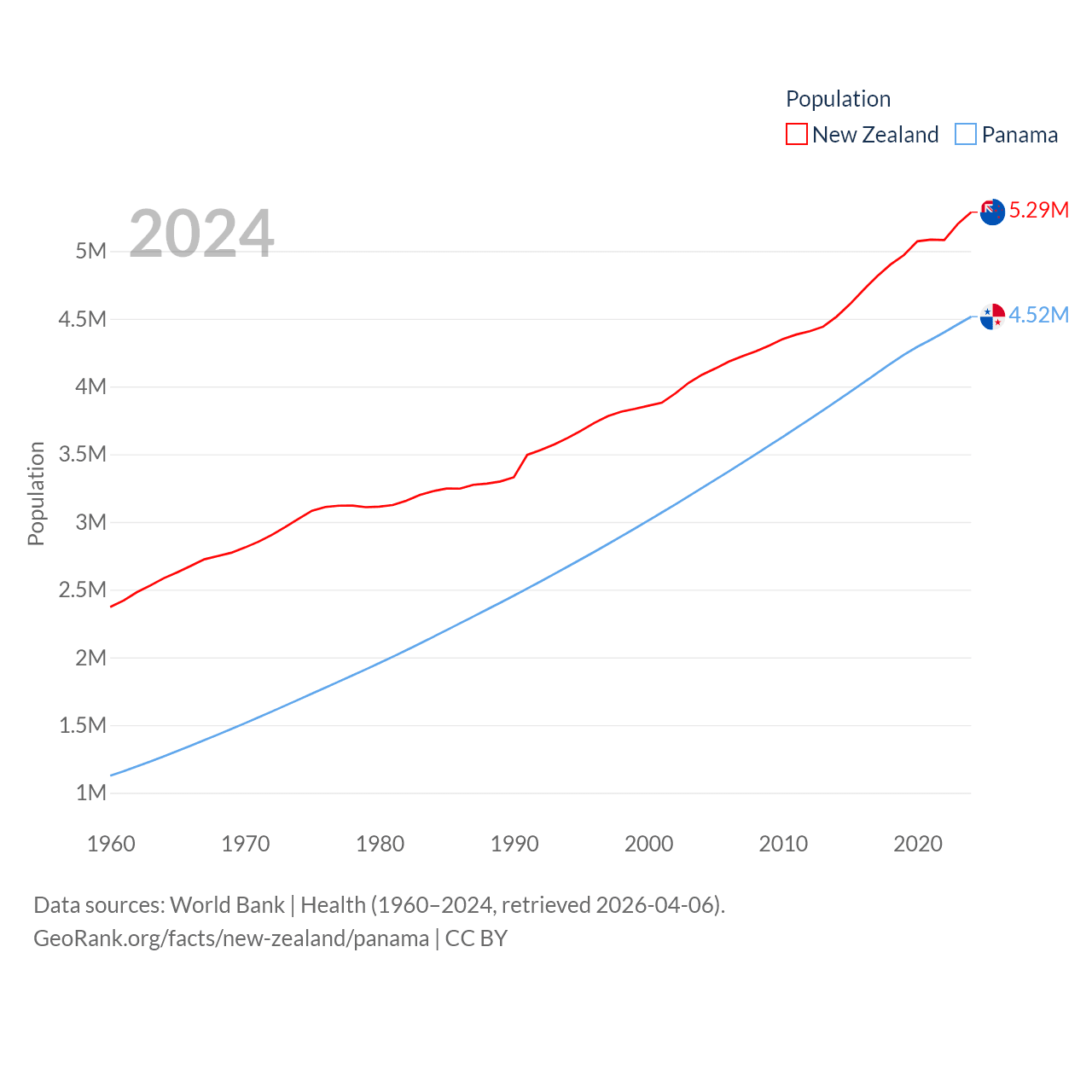 New Zealand has a population of 5.29M (ranked 123/197), compared with 4.52M in Panama (ranked 128/197). New Zealand's land area is 101,665 sq mi versus 28,641 sq mi for Panama (ranked 74th vs. 115th).