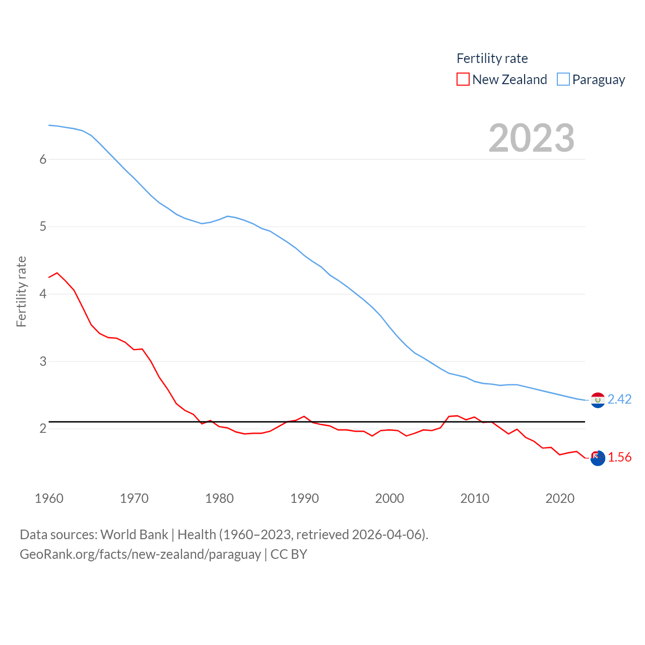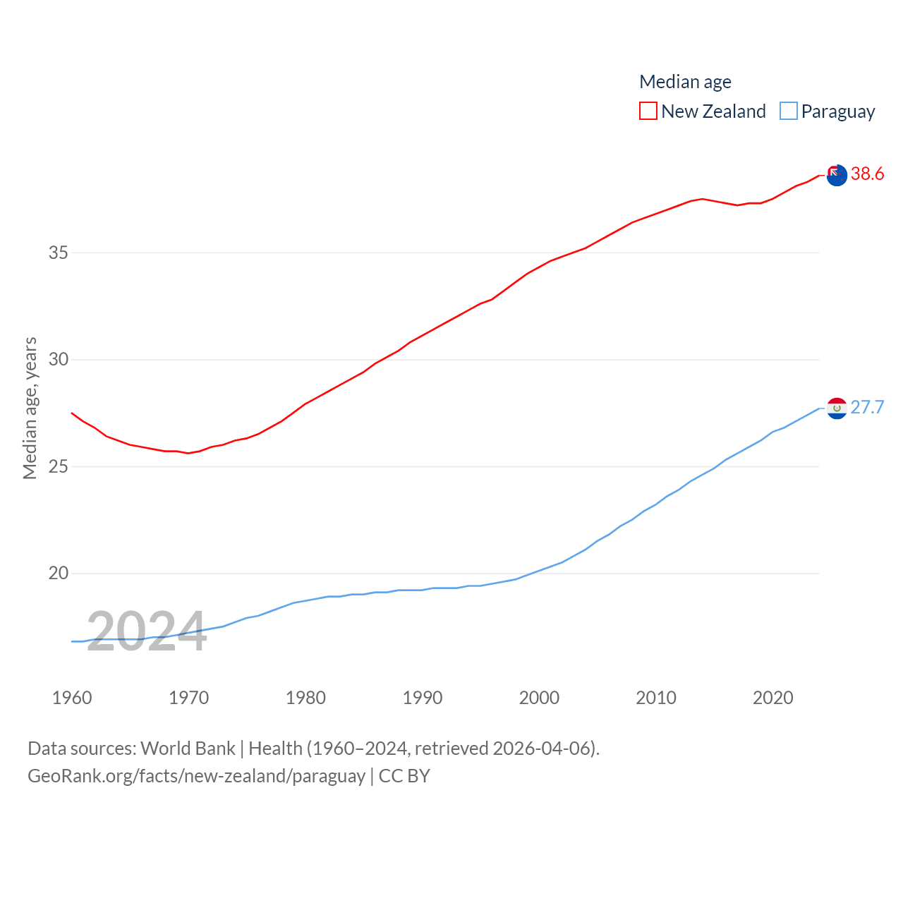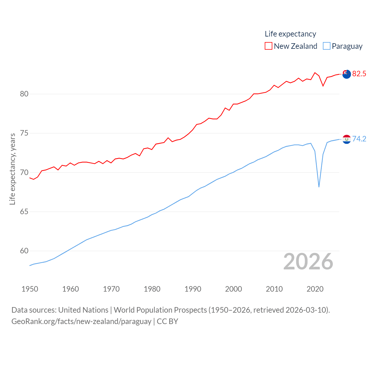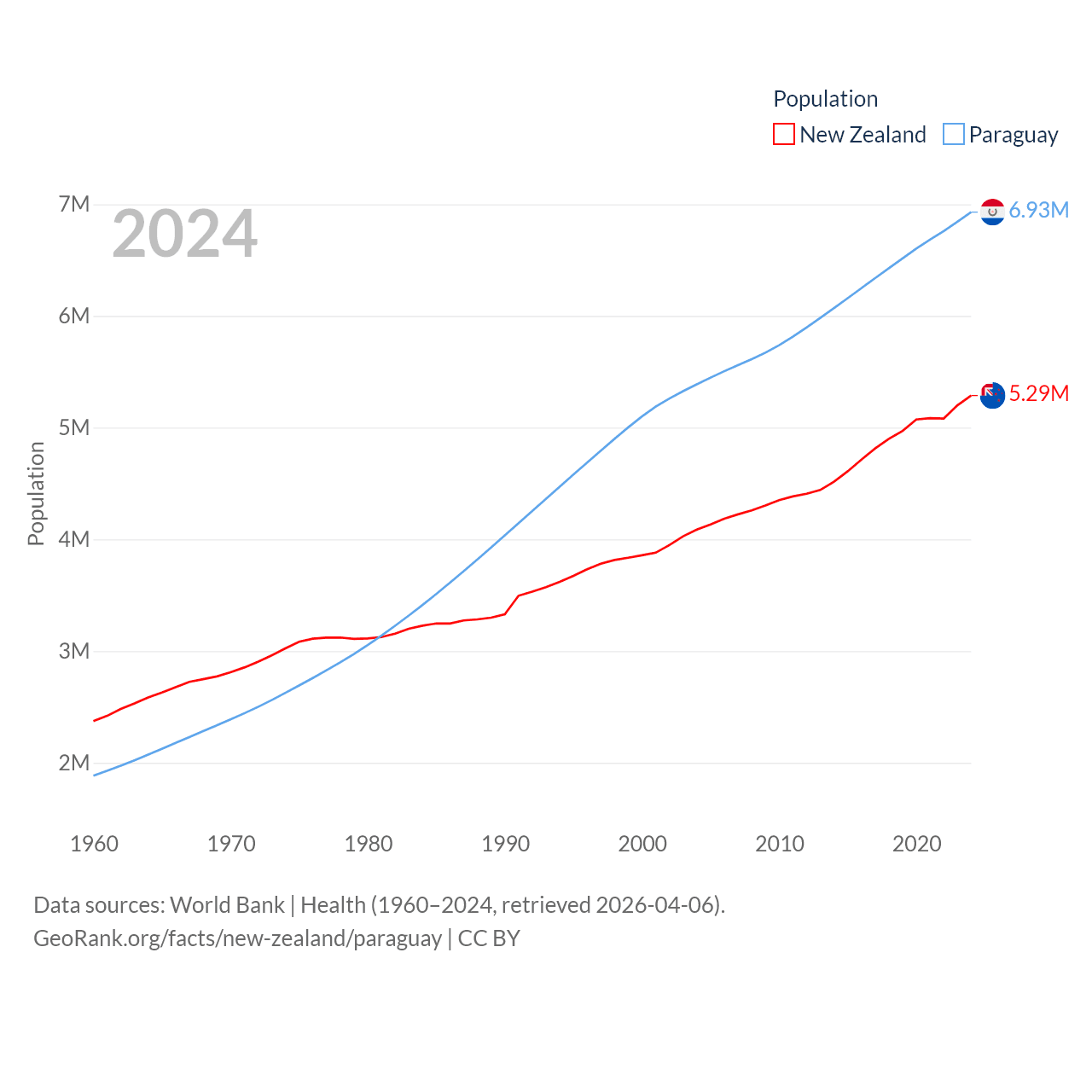 New Zealand has a population of 5.29M (ranked 123/197), compared with 6.93M in Paraguay (ranked 107/197). New Zealand's land area is 101,665 sq mi versus 152,901 sq mi for Paraguay (ranked 74th vs. 59th).
