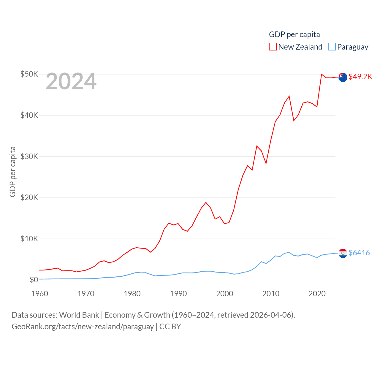 By GDP, New Zealand ranks 52/197 ($260B) and Paraguay ranks 98/197 ($44.5B). By GDP per capita, New Zealand ranks 26/197 ($49,205), while Paraguay ranks 109/197 ($6,416).