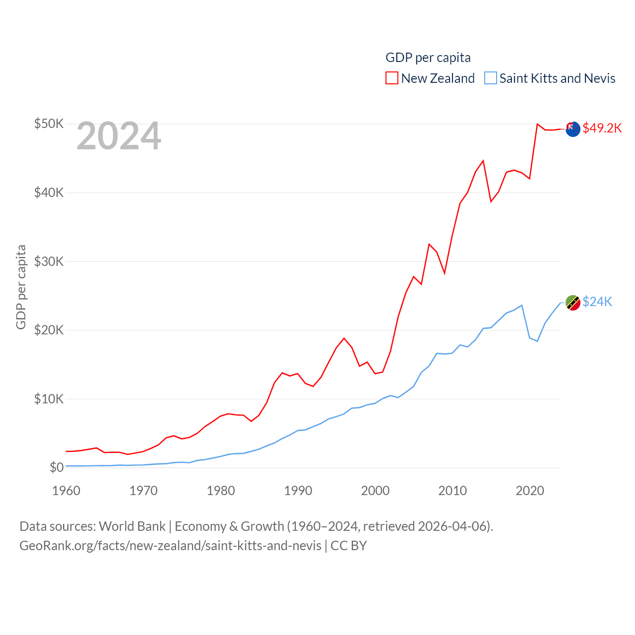 By GDP, New Zealand ranks 52/197 ($260B) and Saint Kitts and Nevis ranks 187/197 ($1.12B). By GDP per capita, New Zealand ranks 26/197 ($49,205), while Saint Kitts and Nevis ranks 51/197 ($23,961).