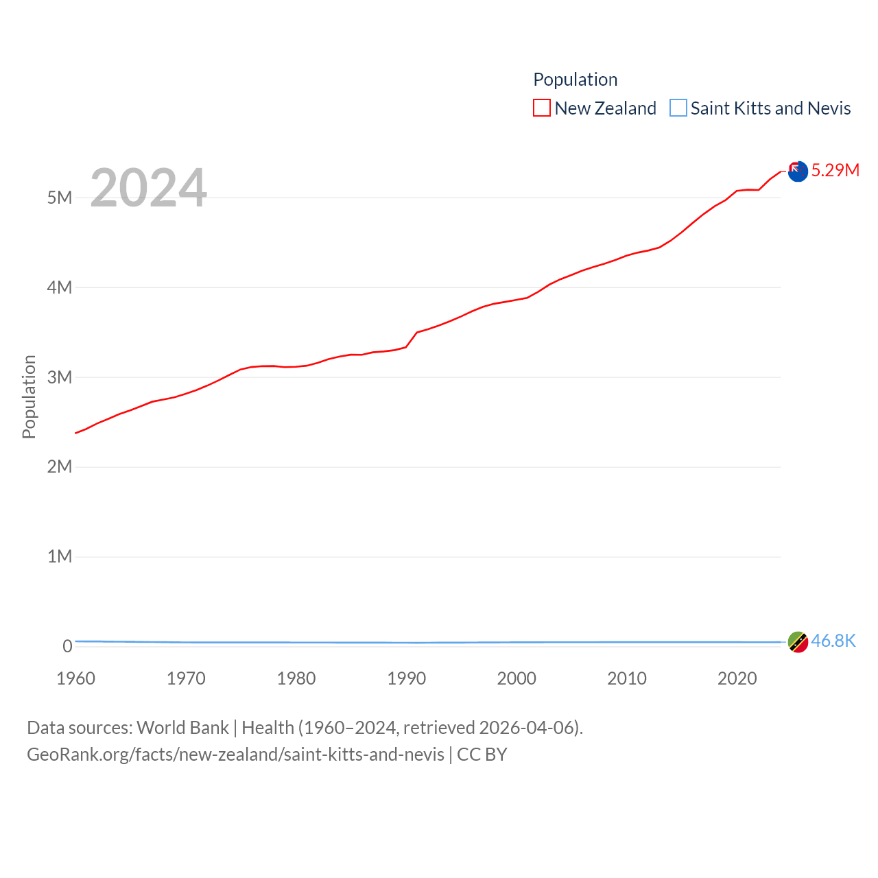 New Zealand has a population of 5.29M (ranked 123/197), compared with 46.8K in Saint Kitts and Nevis (ranked 189/197). New Zealand's land area is 101,665 sq mi versus 100.4 sq mi for Saint Kitts and Nevis (ranked 74th vs. 189th).
