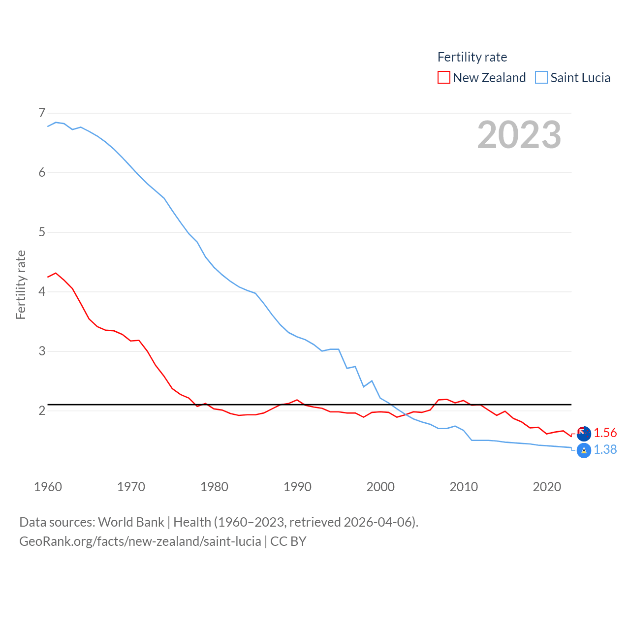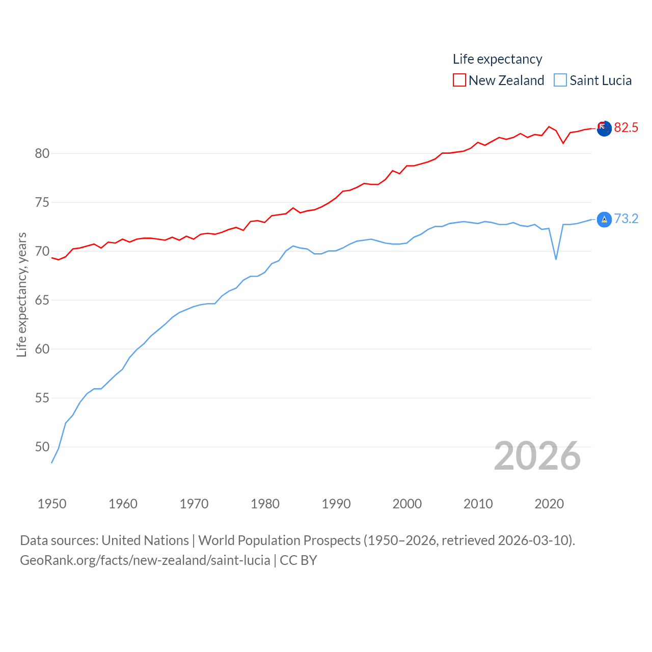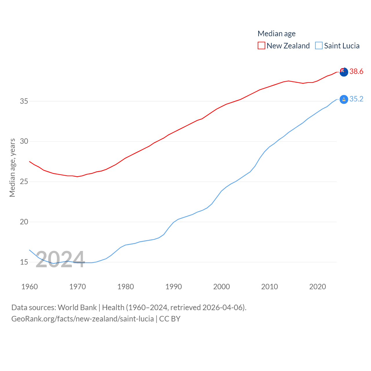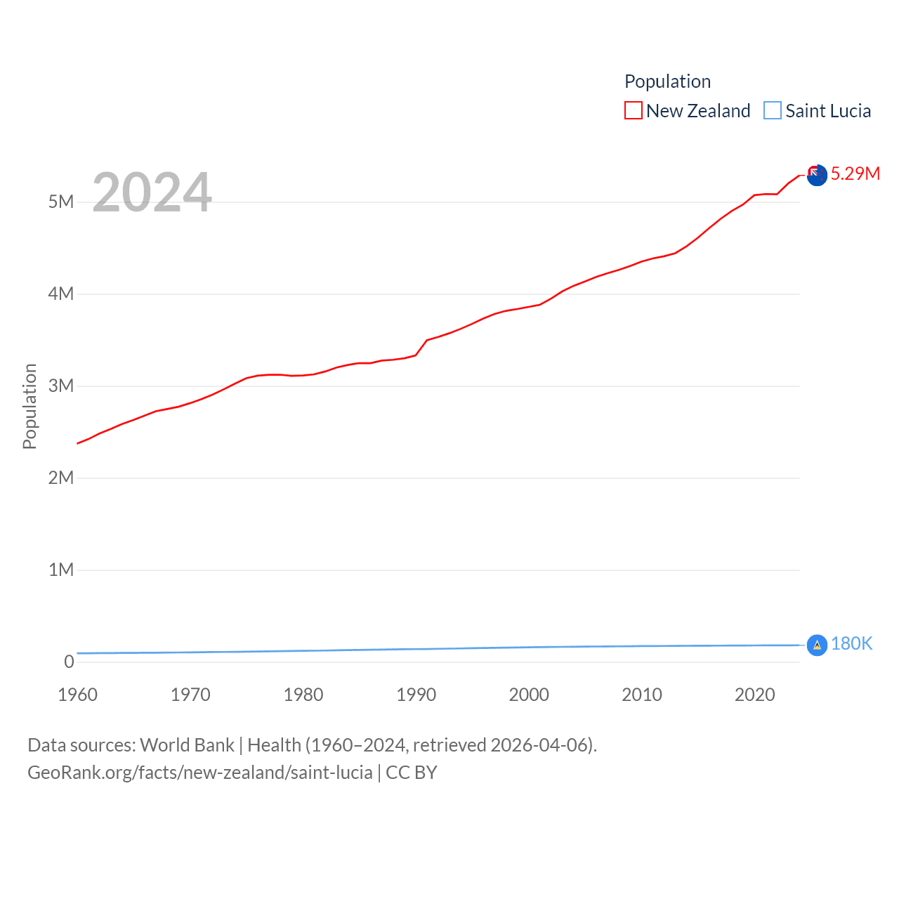 New Zealand has a population of 5.29M (ranked 123/197), compared with 180K in Saint Lucia (ranked 178/197). New Zealand's land area is 101,665 sq mi versus 235.5 sq mi for Saint Lucia (ranked 74th vs. 178th).