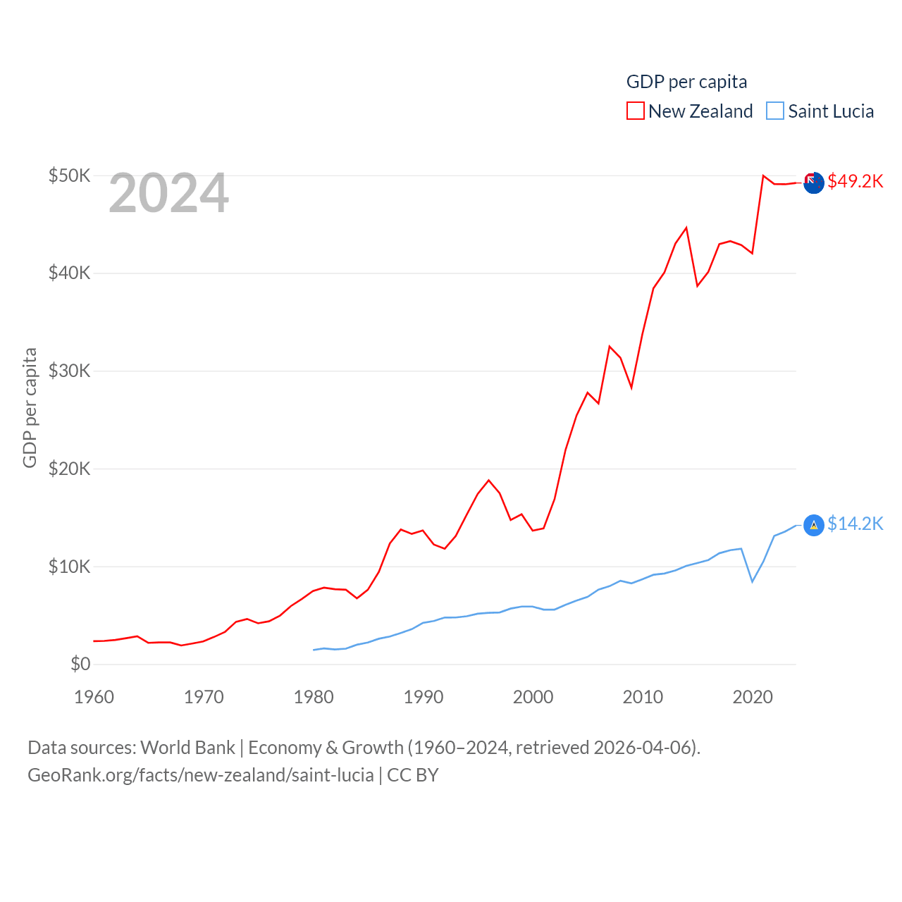 By GDP, New Zealand ranks 52/197 ($260B) and Saint Lucia ranks 173/197 ($2.55B). By GDP per capita, New Zealand ranks 26/197 ($49,205), while Saint Lucia ranks 70/197 ($14,182).