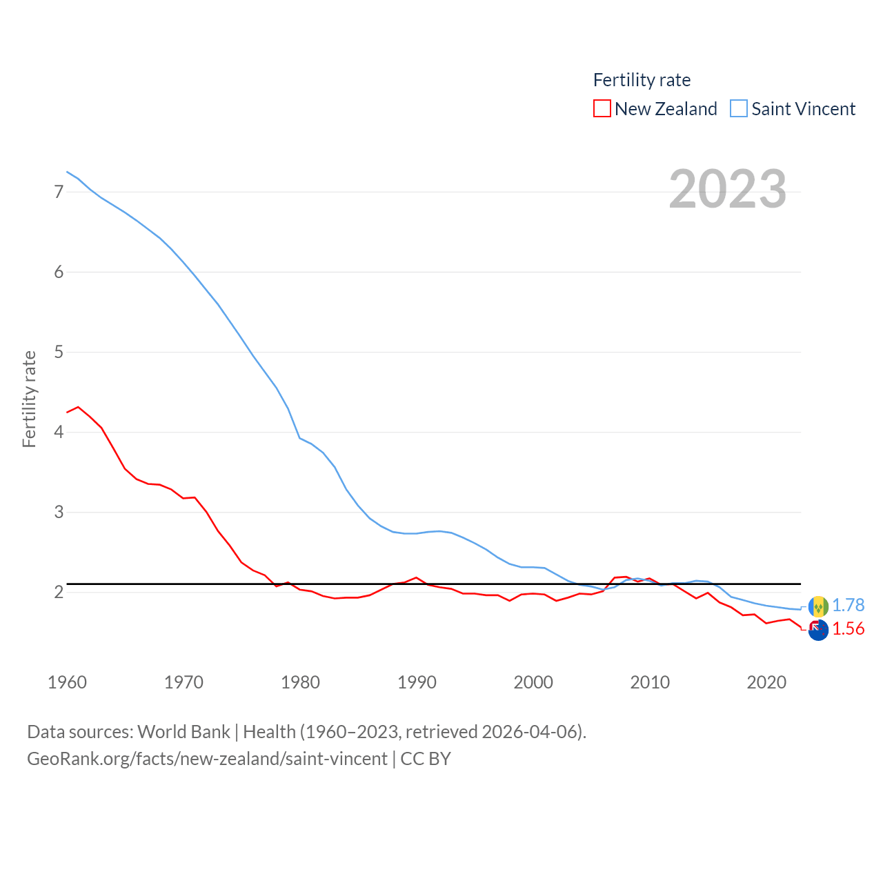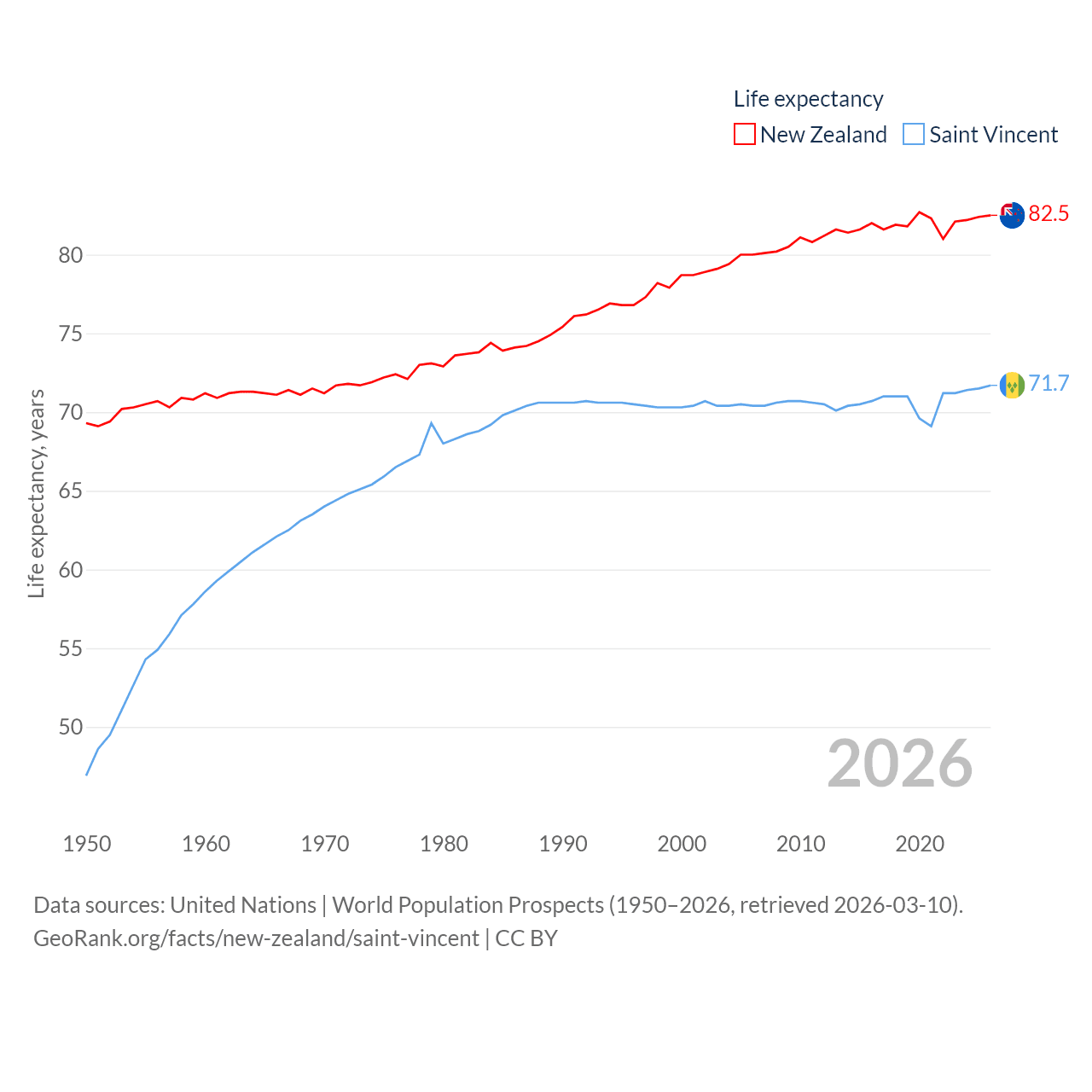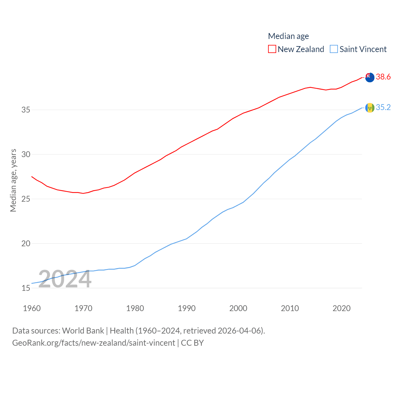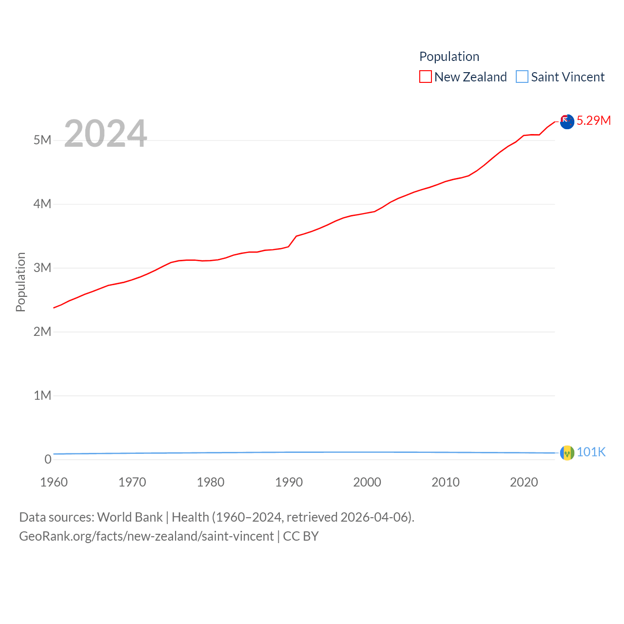 New Zealand has a population of 5.29M (ranked 123/197), compared with 101K in Saint Vincent (ranked 184/197). New Zealand's land area is 101,665 sq mi versus 150.6 sq mi for Saint Vincent (ranked 74th vs. 185th).