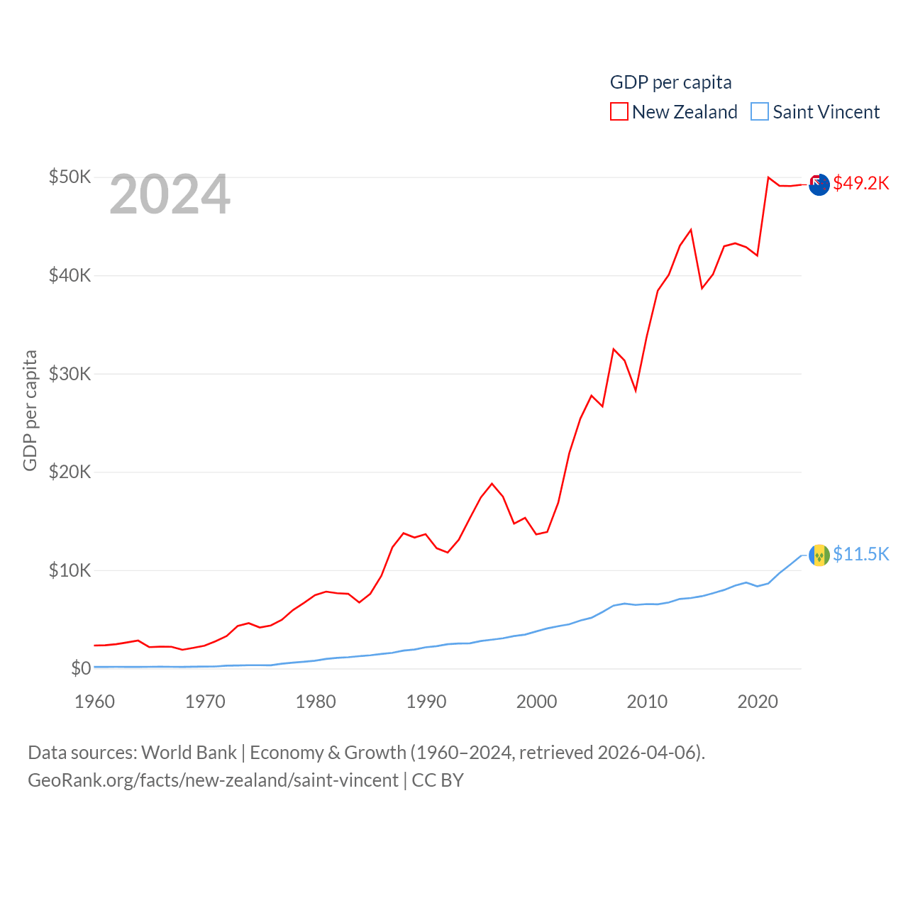 By GDP, New Zealand ranks 52/197 ($260B) and Saint Vincent ranks 186/197 ($1.16B). By GDP per capita, New Zealand ranks 26/197 ($49,205), while Saint Vincent ranks 81/197 ($11,501).