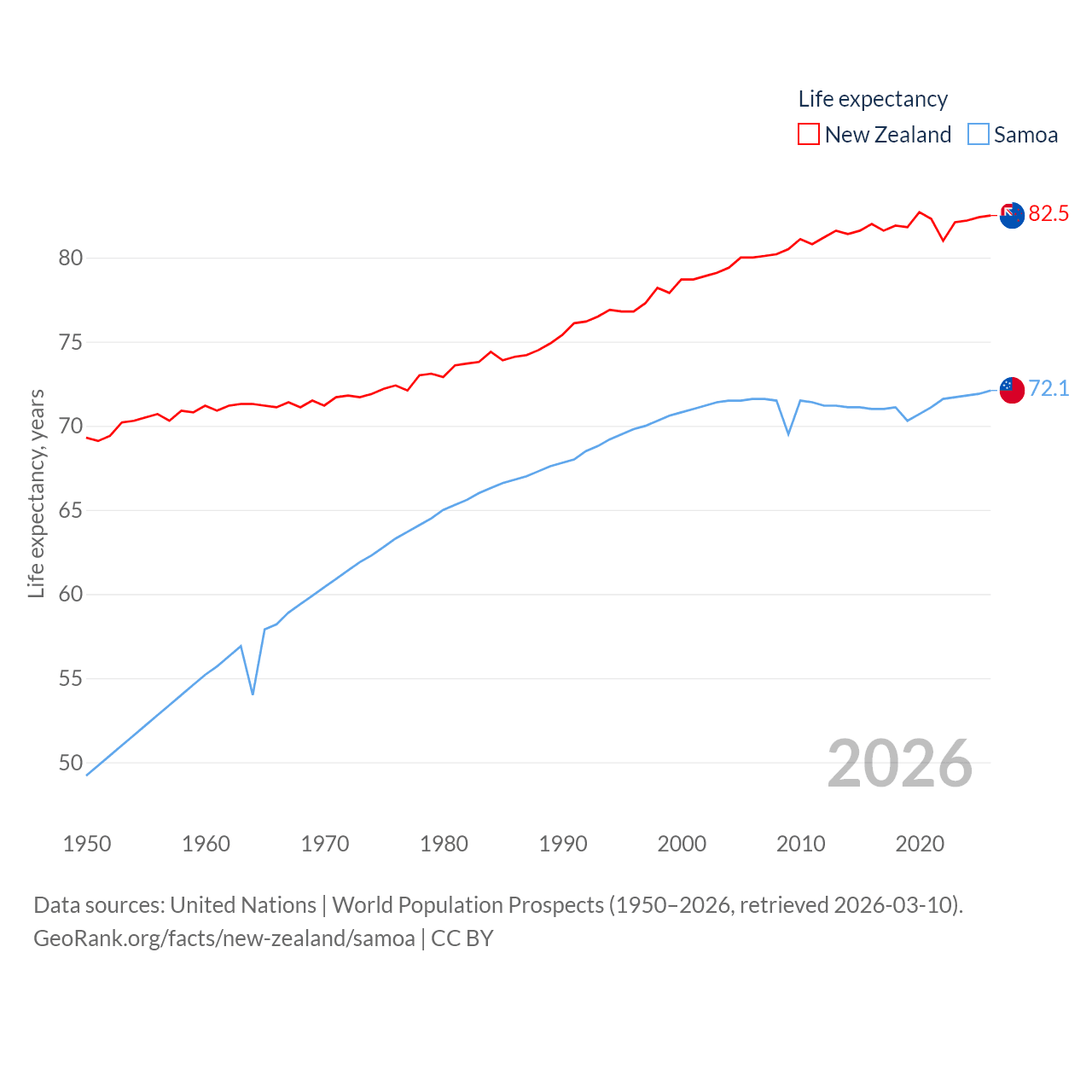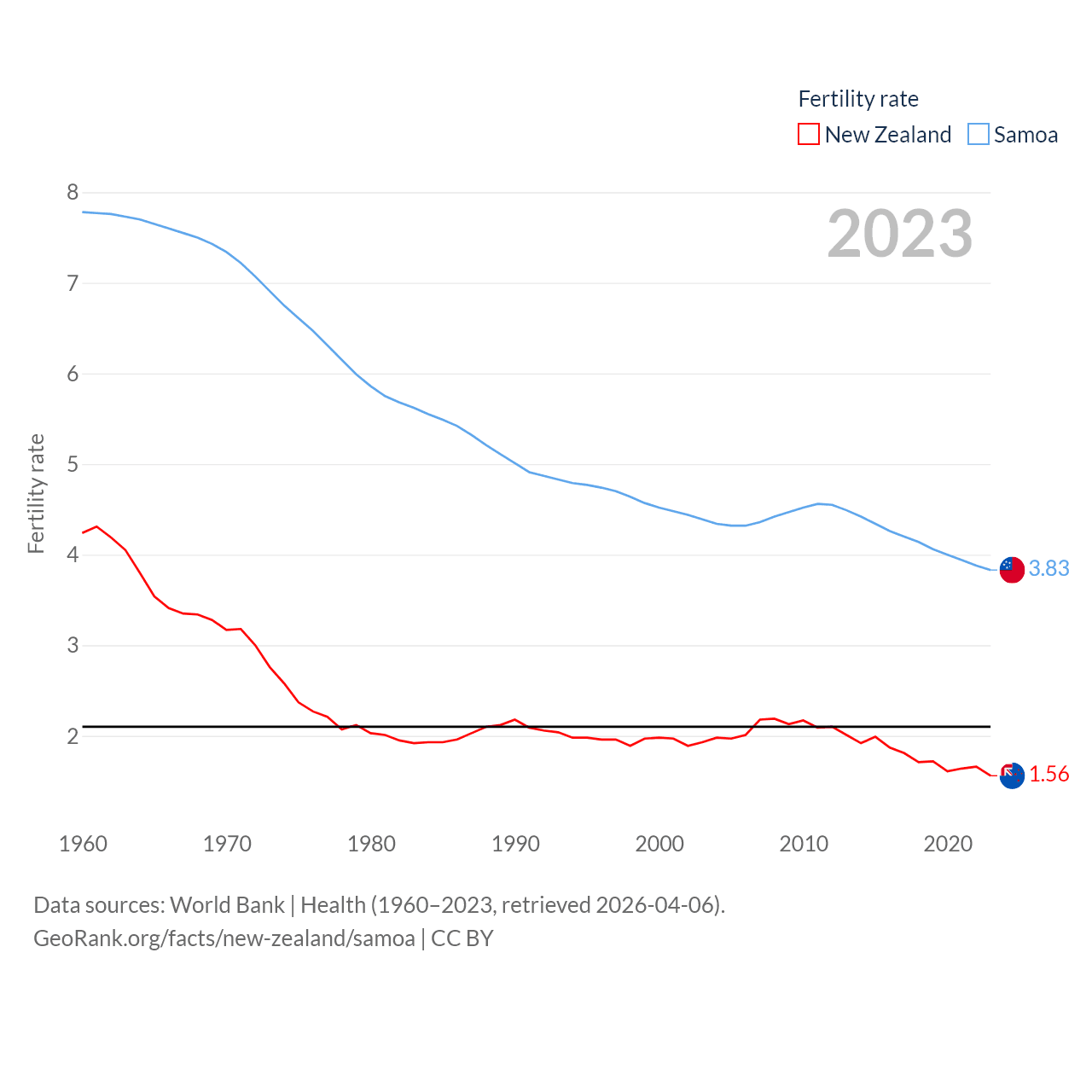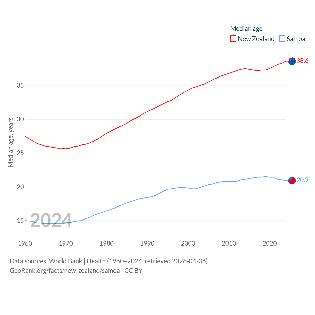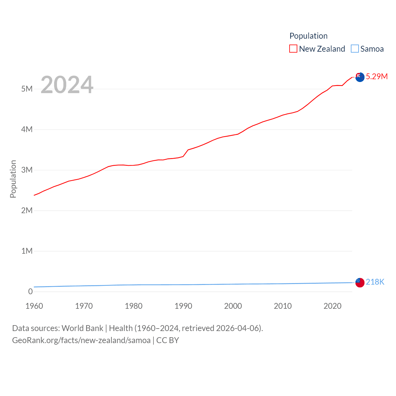 New Zealand has a population of 5.29M (ranked 123/197), compared with 218K in Samoa (ranked 177/197). New Zealand's land area is 101,665 sq mi versus 1,073 sq mi for Samoa (ranked 74th vs. 168th).