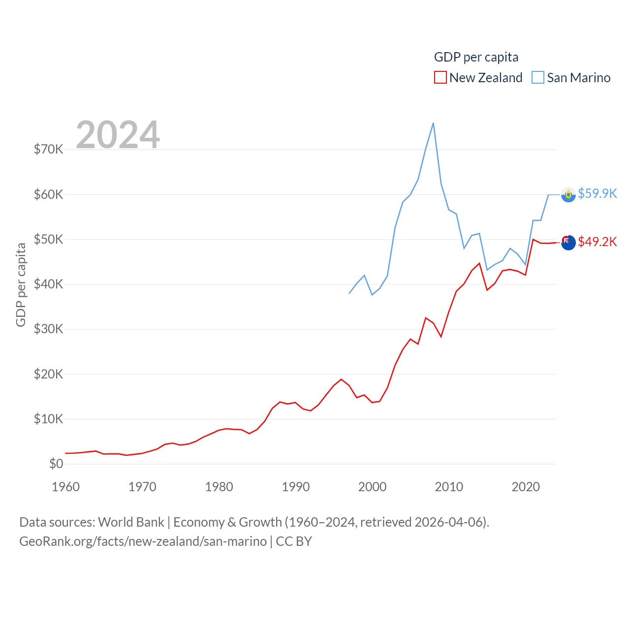 By GDP, New Zealand ranks 52/197 ($260B) and San Marino ranks 180/197 ($2.03B). By GDP per capita, New Zealand ranks 26/197 ($49,205), while San Marino ranks 15/197 ($59,880).