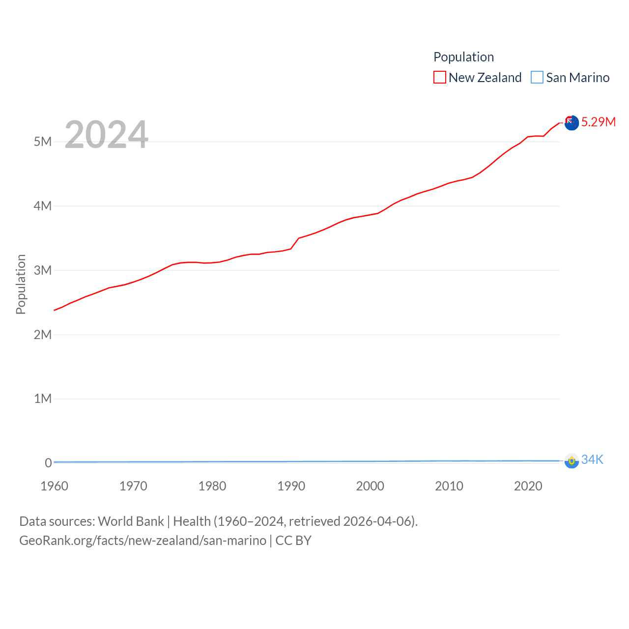 New Zealand has a population of 5.29M (ranked 123/197), compared with 34K in San Marino (ranked 193/197). New Zealand's land area is 101,665 sq mi versus 23.2 sq mi for San Marino (ranked 74th vs. 193rd).