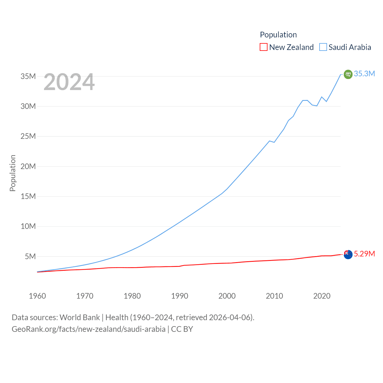 New Zealand has a population of 5.29M (ranked 123/197), compared with 35.3M in Saudi Arabia (ranked 45/197). New Zealand's land area is 101,665 sq mi versus 830,000 sq mi for Saudi Arabia (ranked 74th vs. 12th).