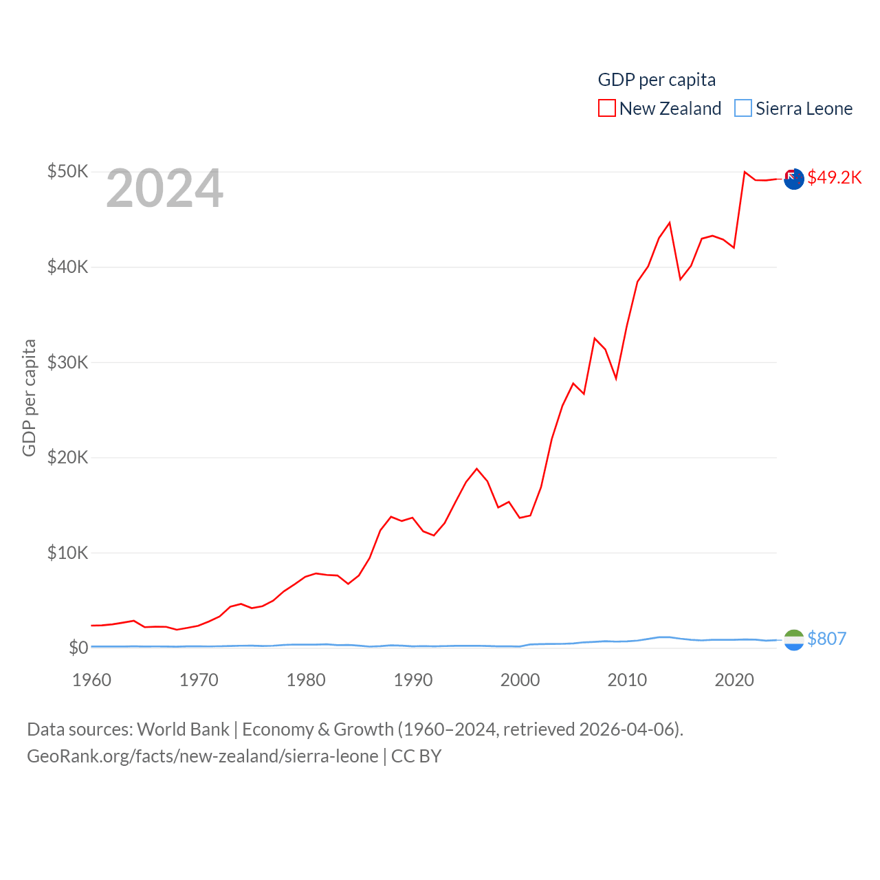 By GDP, New Zealand ranks 52/197 ($260B) and Sierra Leone ranks 160/197 ($6.97B). By GDP per capita, New Zealand ranks 26/197 ($49,205), while Sierra Leone ranks 186/197 ($807).