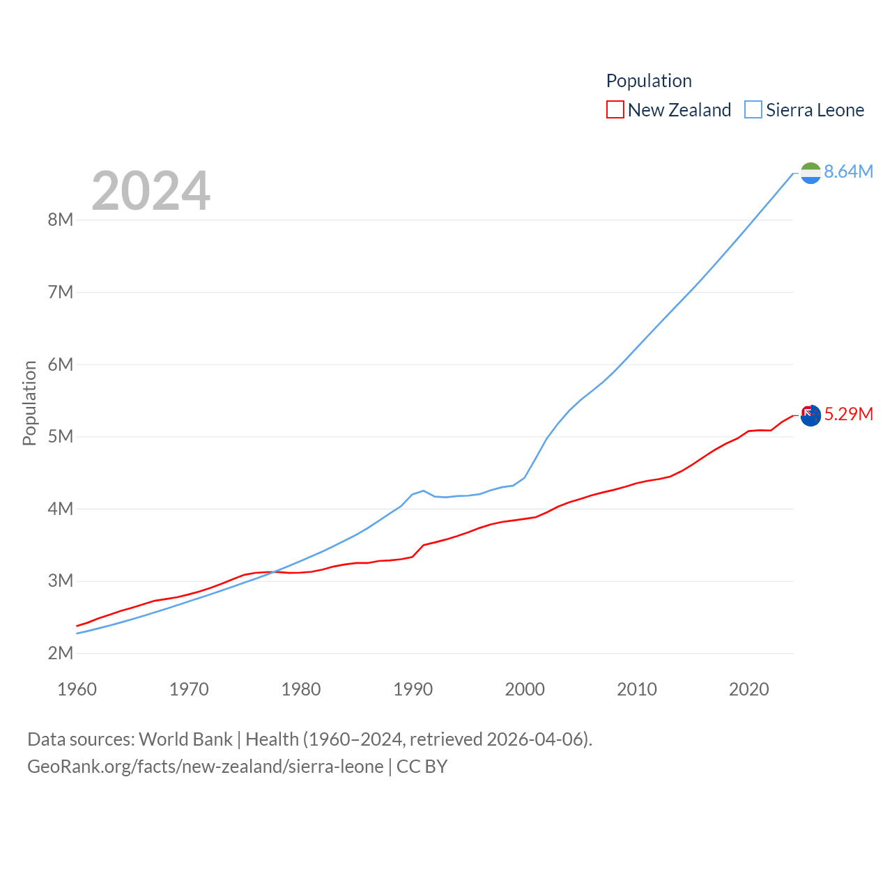 New Zealand has a population of 5.29M (ranked 123/197), compared with 8.64M in Sierra Leone (ranked 102/197). New Zealand's land area is 101,665 sq mi versus 27,869 sq mi for Sierra Leone (ranked 74th vs. 116th).