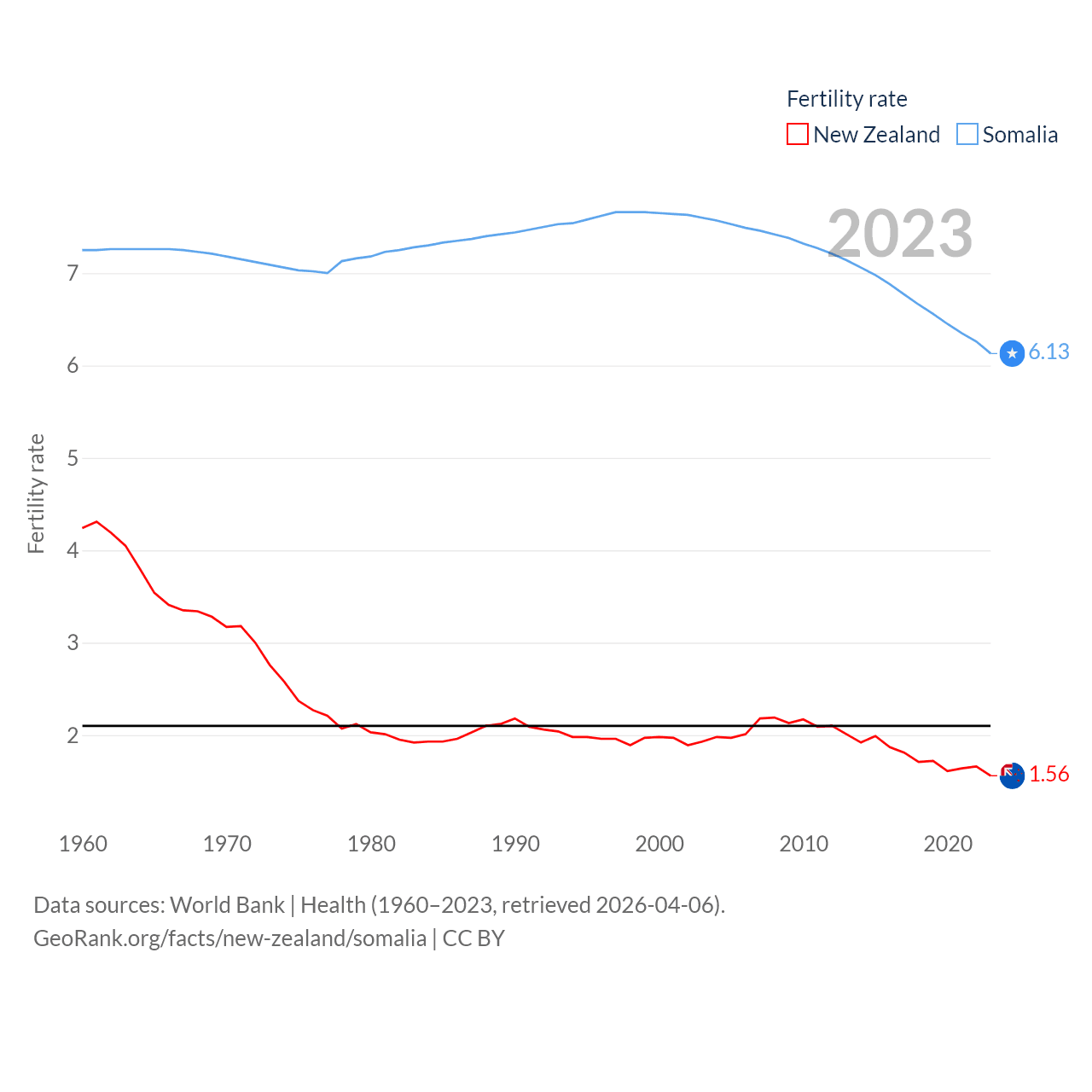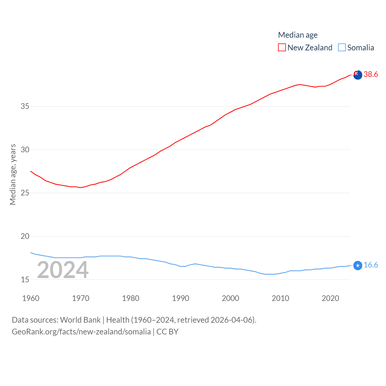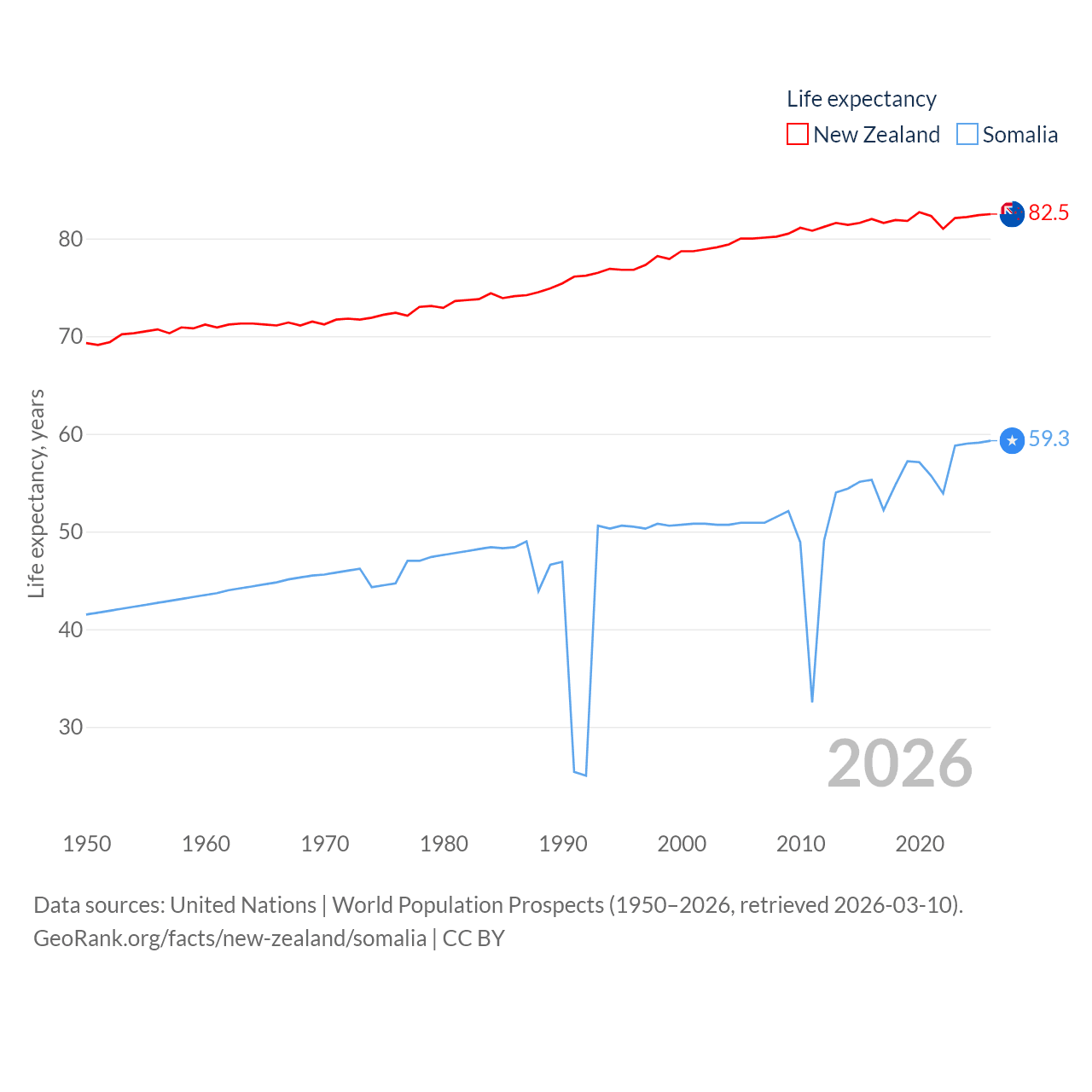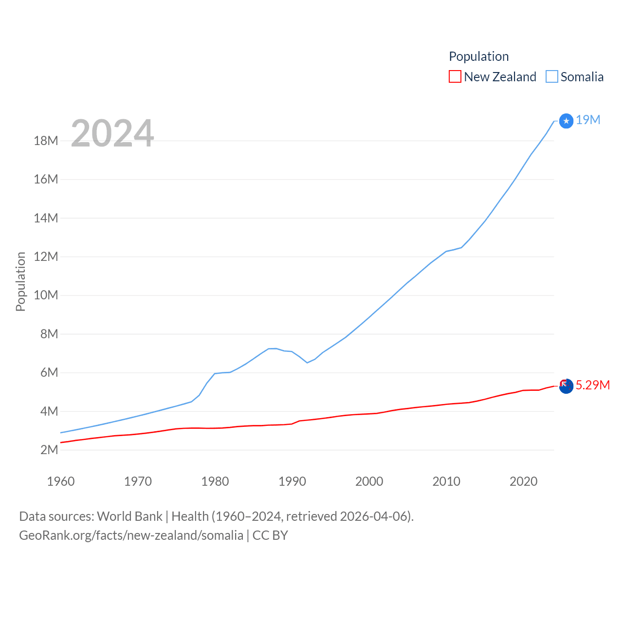New Zealand has a population of 5.29M (ranked 123/197), compared with 19M in Somalia (ranked 68/197). New Zealand's land area is 101,665 sq mi versus 242,217 sq mi for Somalia (ranked 74th vs. 42nd).
