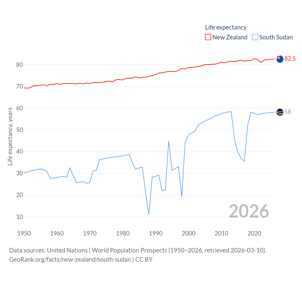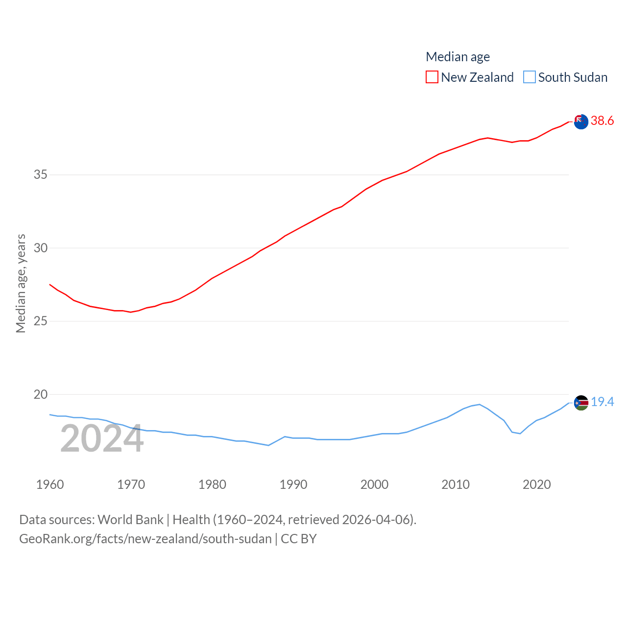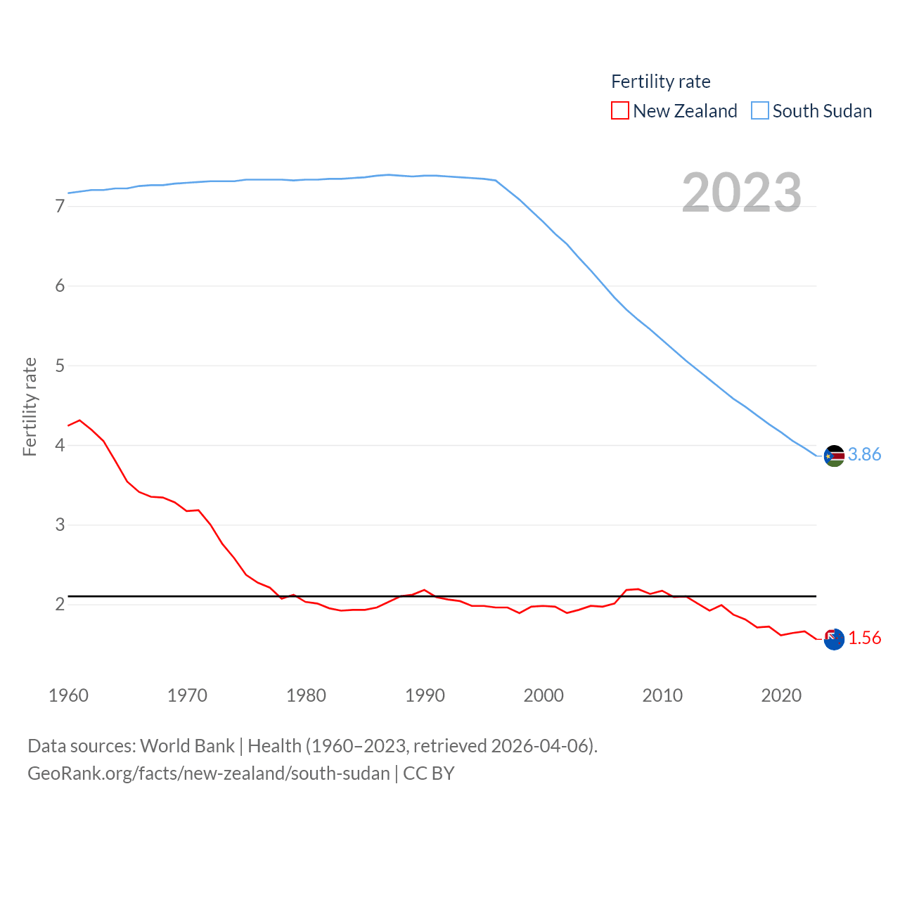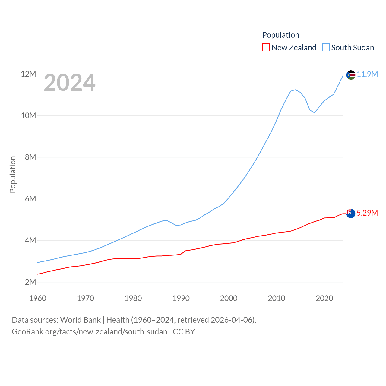 New Zealand has a population of 5.29M (ranked 123/197), compared with 11.9M in South Sudan (ranked 81/197). New Zealand's land area is 101,665 sq mi versus 243,990 sq mi for South Sudan (ranked 74th vs. 41st).