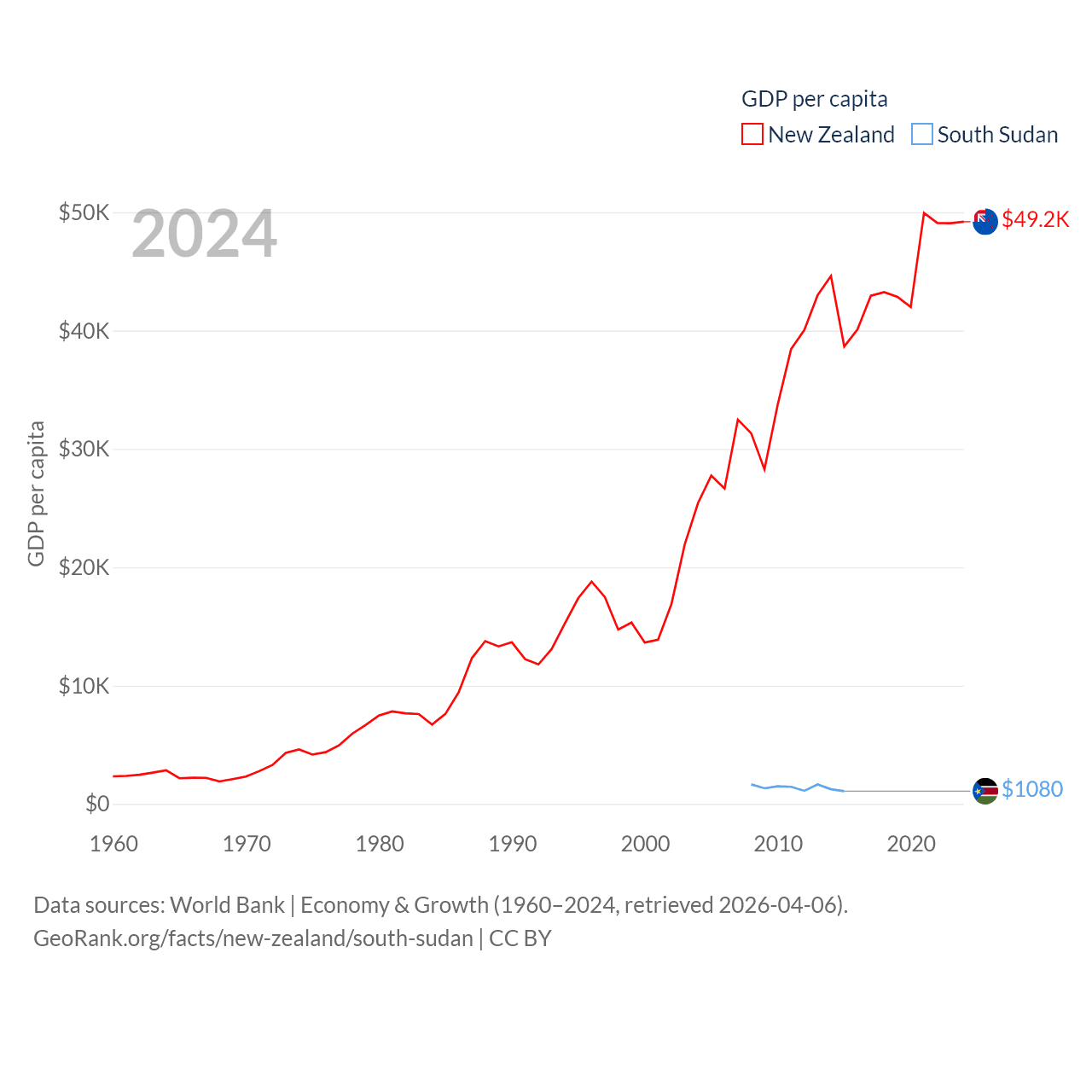 By GDP, New Zealand ranks 52/197 ($260B) and South Sudan ranks 149/197 ($12B). By GDP per capita, New Zealand ranks 26/197 ($49,205), while South Sudan ranks 175/197 ($1,080).