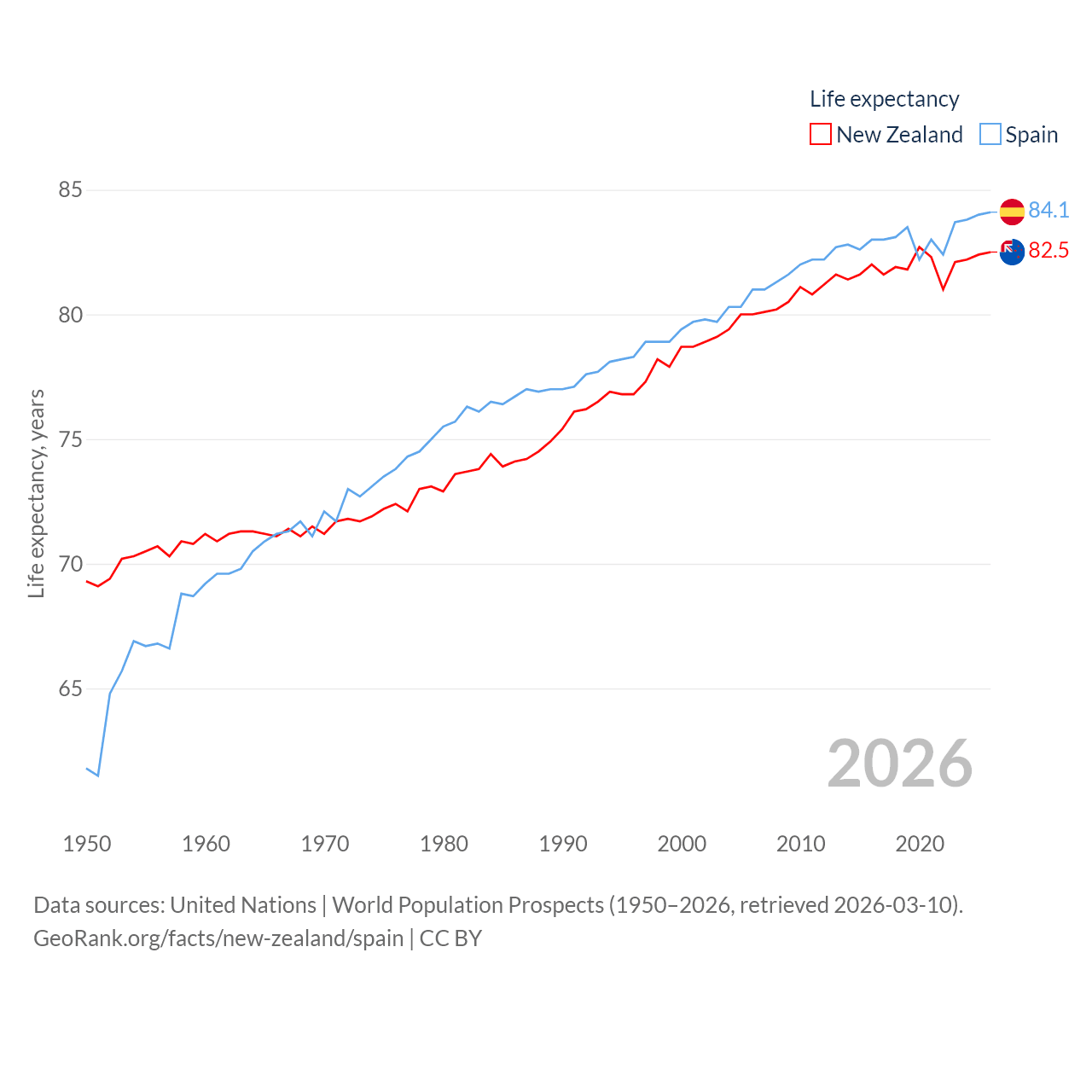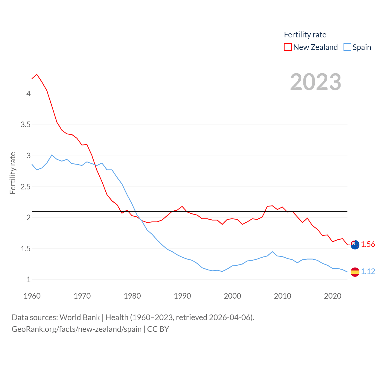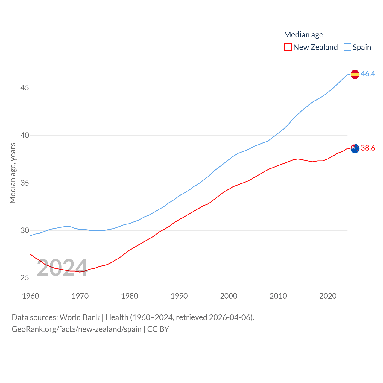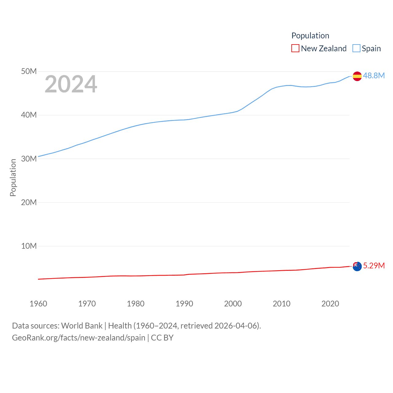 New Zealand has a population of 5.29M (ranked 123/197), compared with 48.8M in Spain (ranked 32/197). New Zealand's land area is 101,665 sq mi versus 192,934 sq mi for Spain (ranked 74th vs. 51st).