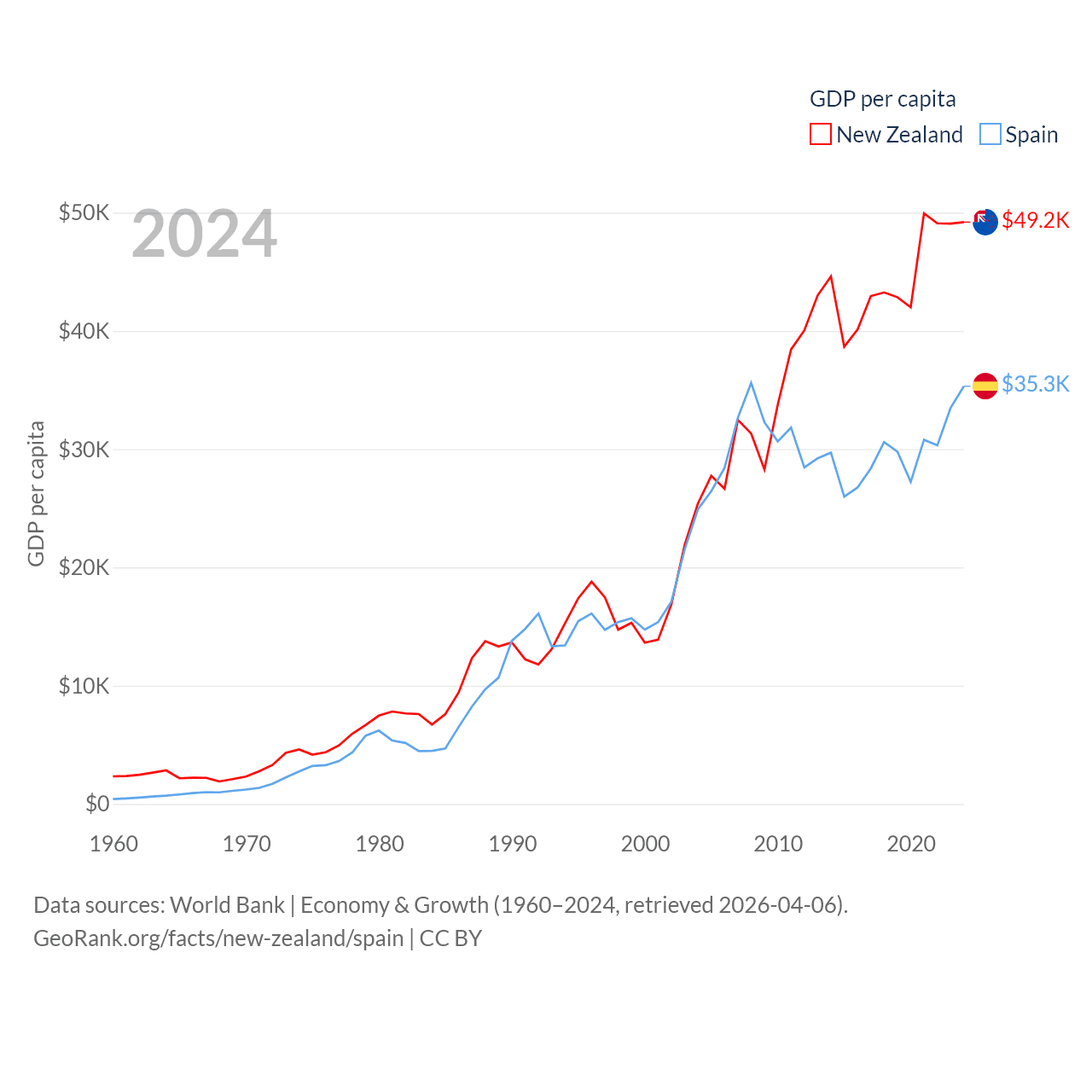By GDP, New Zealand ranks 52/197 ($260B) and Spain ranks 15/197 ($1.73T). By GDP per capita, New Zealand ranks 26/197 ($49,205), while Spain ranks 32/197 ($35,327).