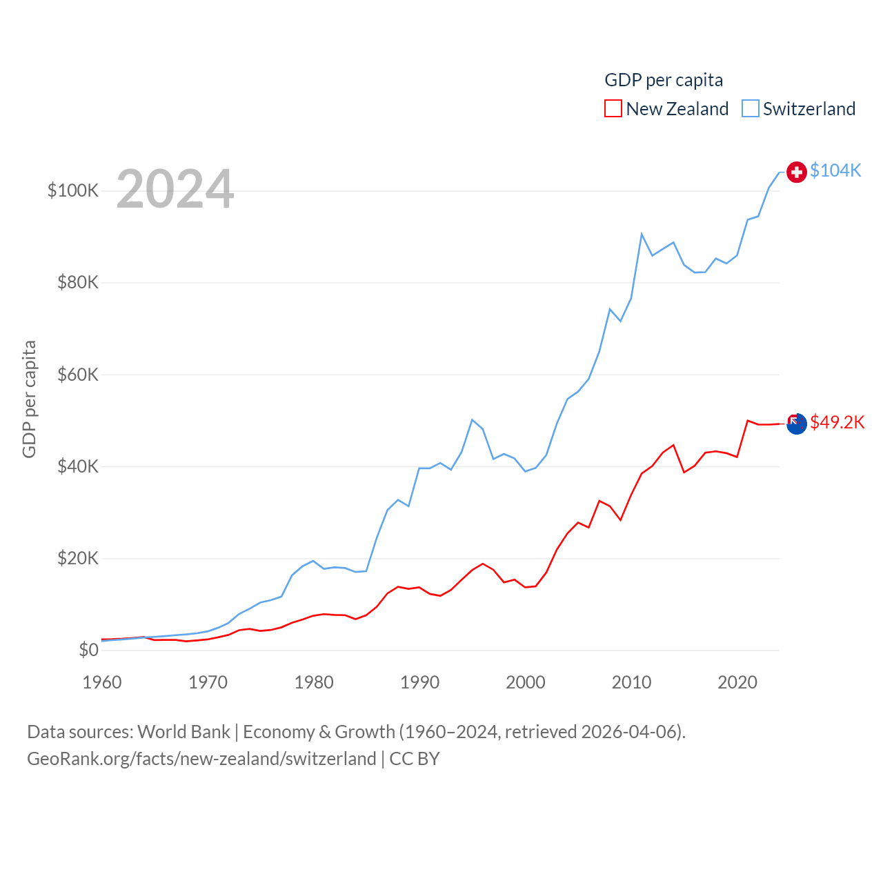 By GDP, New Zealand ranks 52/197 ($260B) and Switzerland ranks 20/197 ($937B). By GDP per capita, New Zealand ranks 26/197 ($49,205), while Switzerland ranks 5/197 ($103,998).