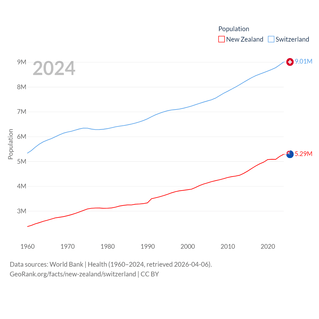New Zealand has a population of 5.29M (ranked 123/197), compared with 9.01M in Switzerland (ranked 101/197). New Zealand's land area is 101,665 sq mi versus 15,255 sq mi for Switzerland (ranked 74th vs. 131st).