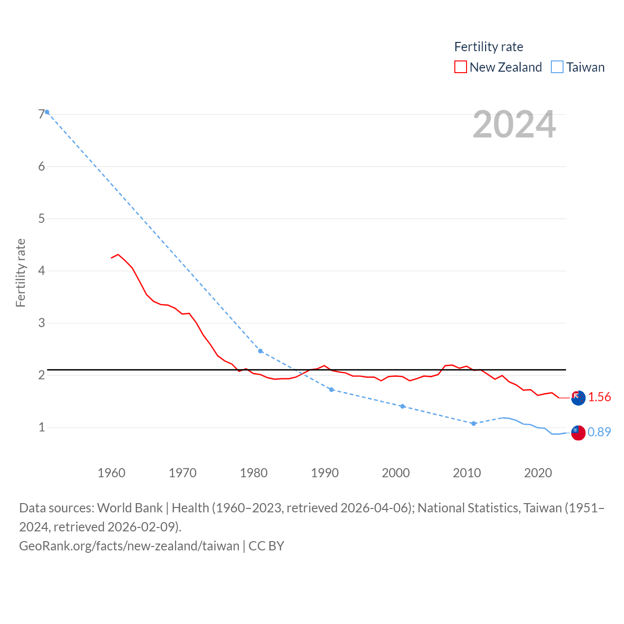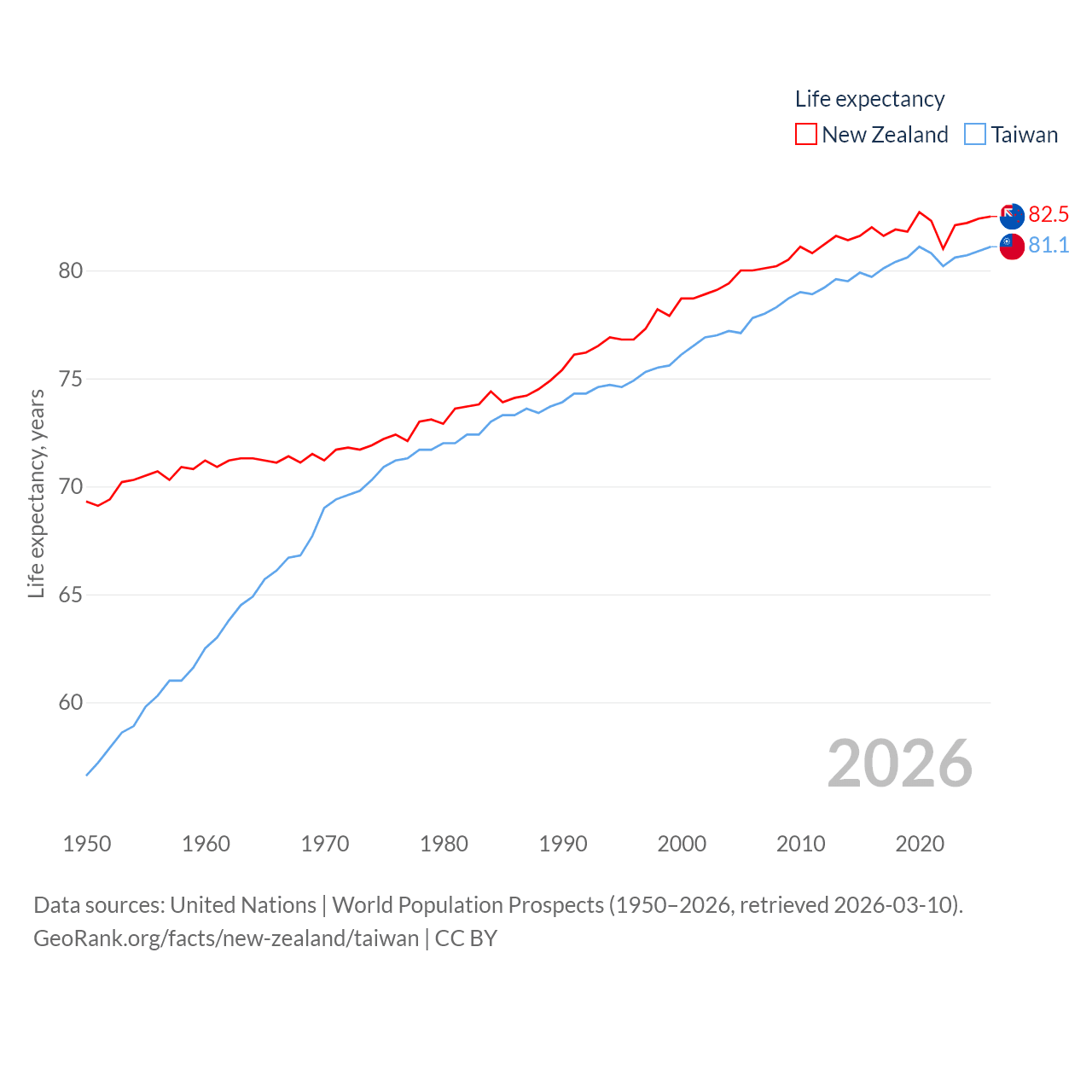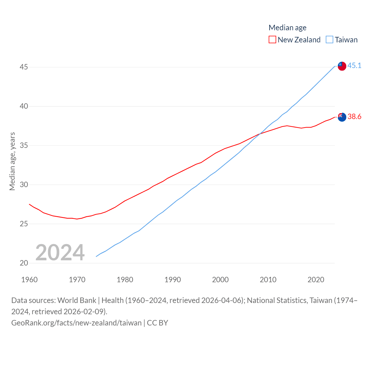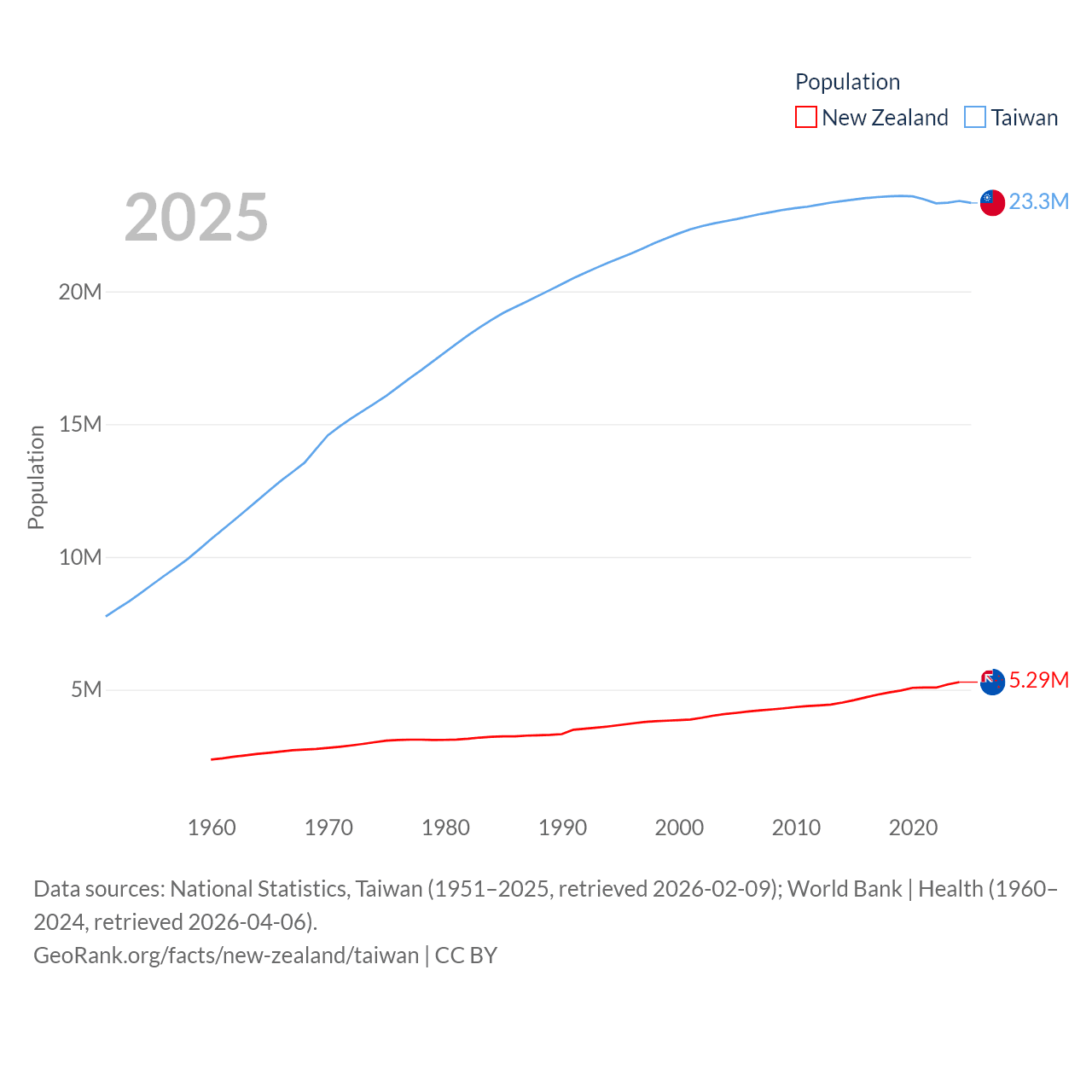 New Zealand has a population of 5.29M (ranked 123/197), compared with 23.3M in Taiwan (ranked 60/197). New Zealand's land area is 101,665 sq mi versus 13,976 sq mi for Taiwan (ranked 74th vs. 133rd).