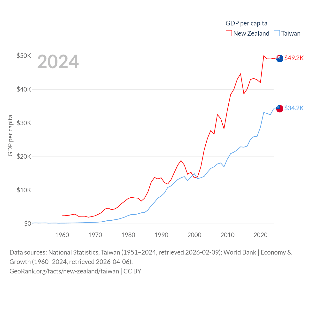By GDP, New Zealand ranks 52/197 ($260B) and Taiwan ranks 22/197 ($802B). By GDP per capita, New Zealand ranks 26/197 ($49,205), while Taiwan ranks 35/197 ($34,238).