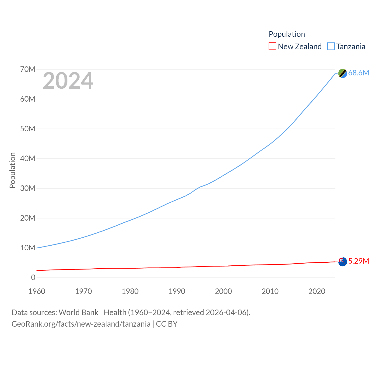 New Zealand has a population of 5.29M (ranked 123/197), compared with 68.6M in Tanzania (ranked 22/197). New Zealand's land area is 101,665 sq mi versus 342,009 sq mi for Tanzania (ranked 74th vs. 31st).