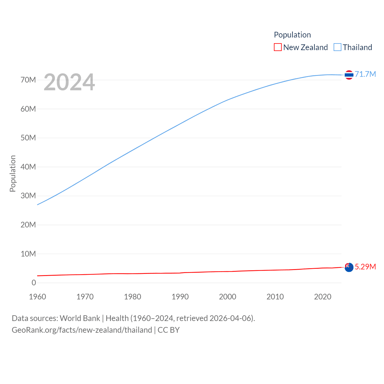 New Zealand has a population of 5.29M (ranked 123/197), compared with 71.7M in Thailand (ranked 20/197). New Zealand's land area is 101,665 sq mi versus 197,256 sq mi for Thailand (ranked 74th vs. 50th).