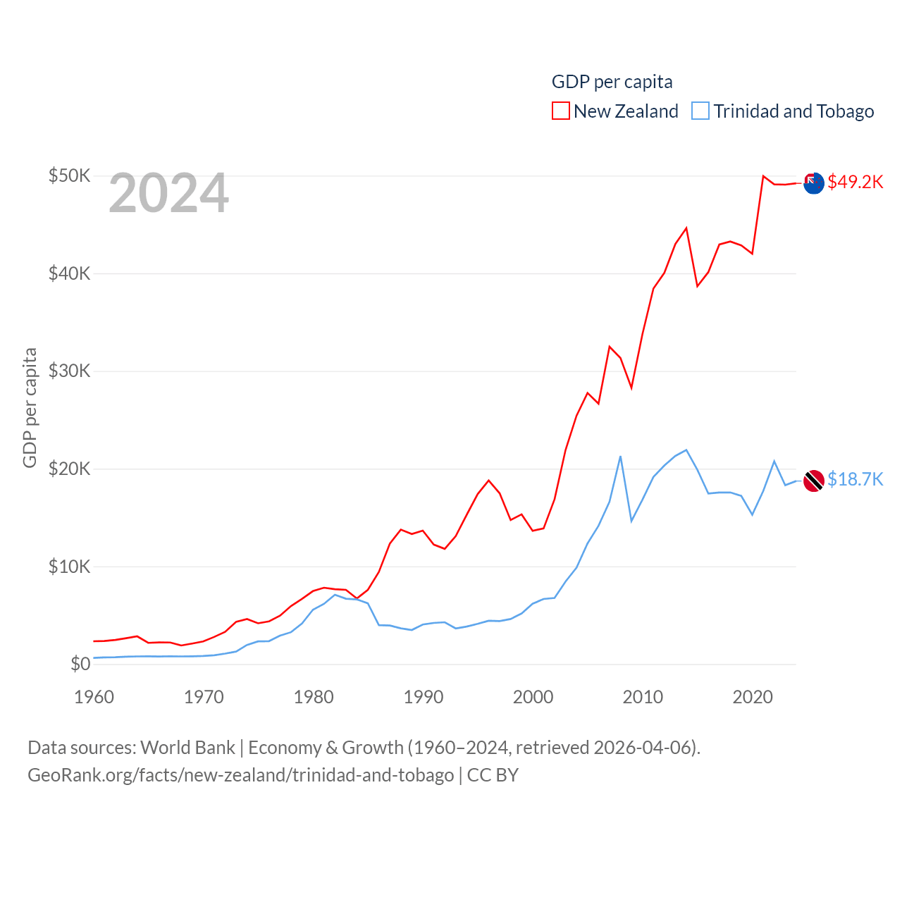By GDP, New Zealand ranks 52/197 ($260B) and Trinidad and Tobago ranks 115/197 ($25.6B). By GDP per capita, New Zealand ranks 26/197 ($49,205), while Trinidad and Tobago ranks 61/197 ($18,733).