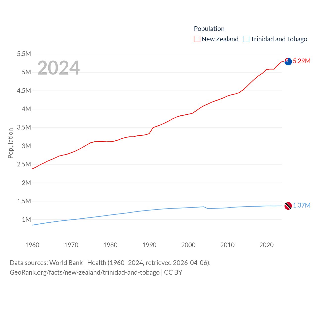 New Zealand has a population of 5.29M (ranked 123/197), compared with 1.37M in Trinidad and Tobago (ranked 154/197). New Zealand's land area is 101,665 sq mi versus 1,981 sq mi for Trinidad and Tobago (ranked 74th vs. 166th).
