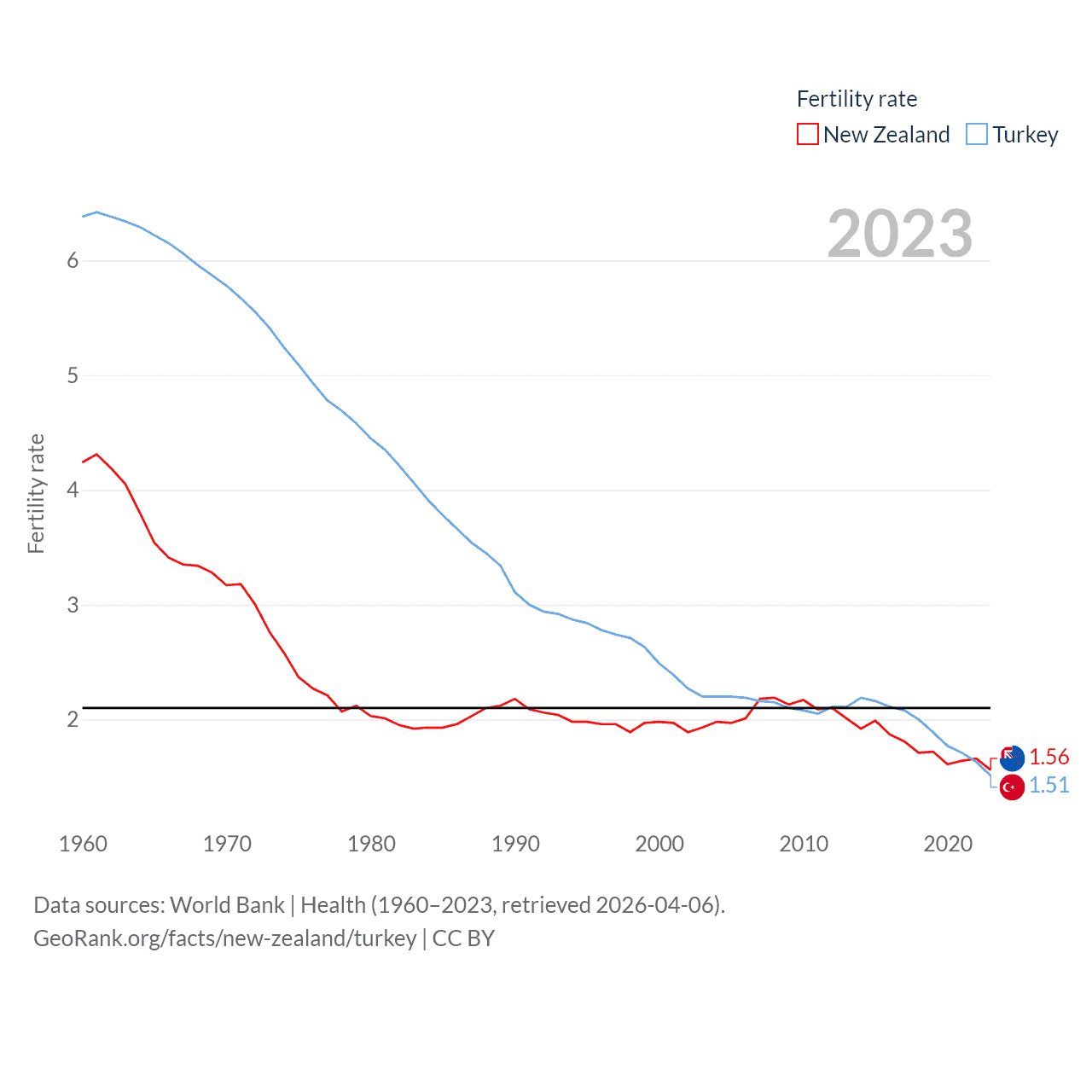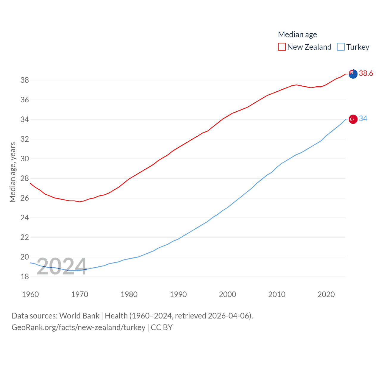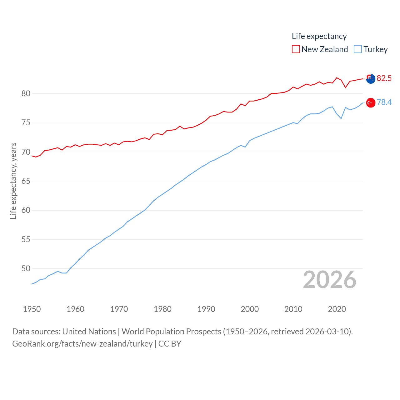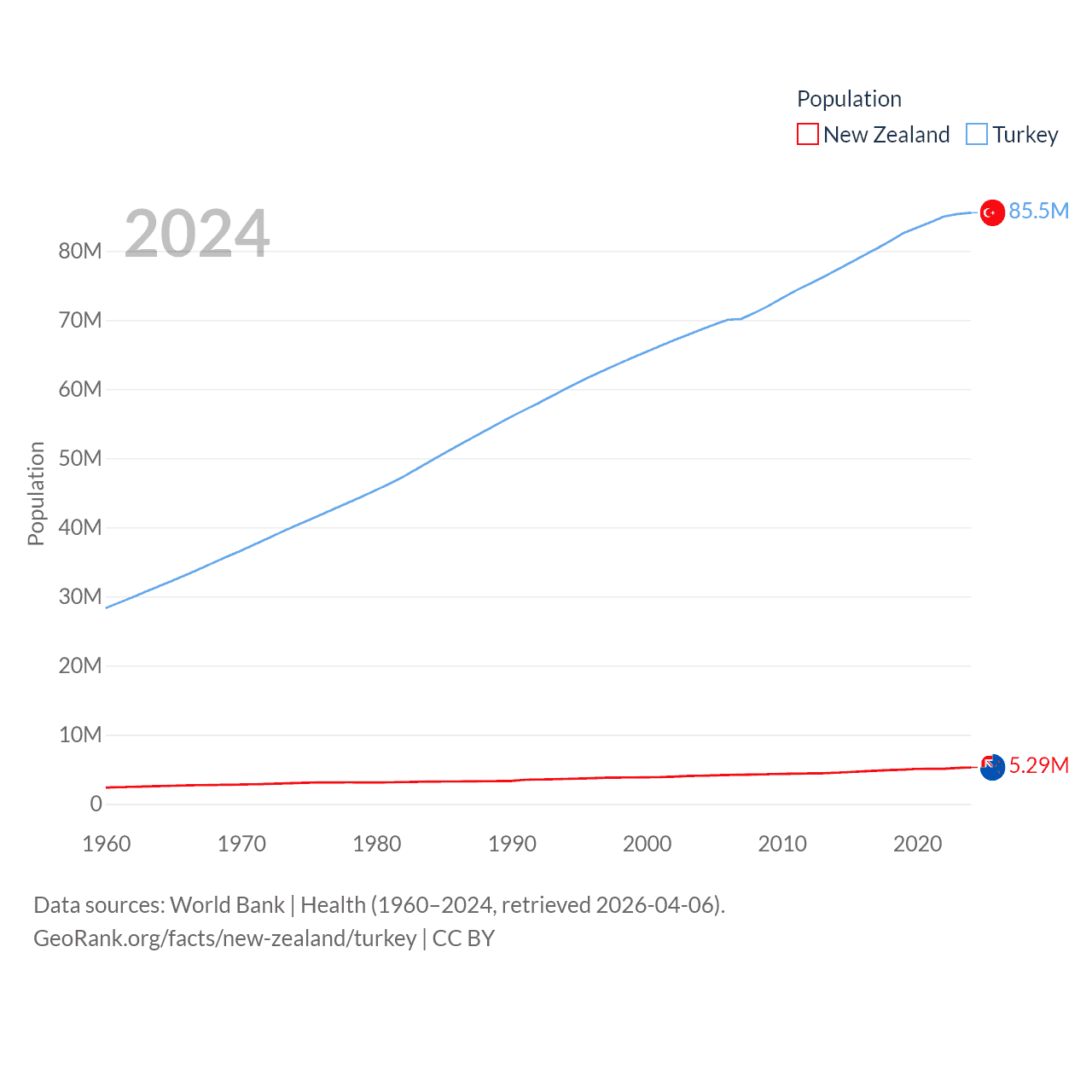 New Zealand has a population of 5.29M (ranked 123/197), compared with 85.5M in Turkey (ranked 18/197). New Zealand's land area is 101,665 sq mi versus 297,156 sq mi for Turkey (ranked 74th vs. 36th).