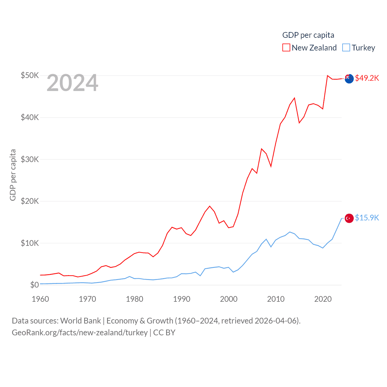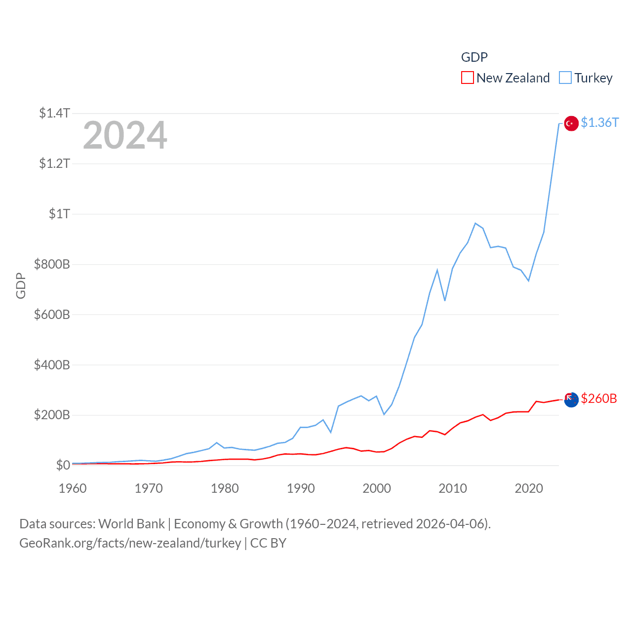By GDP, New Zealand ranks 52/197 ($260B) and Turkey ranks 17/197 ($1.36T). By GDP per capita, New Zealand ranks 26/197 ($49,205), while Turkey ranks 66/197 ($15,893).