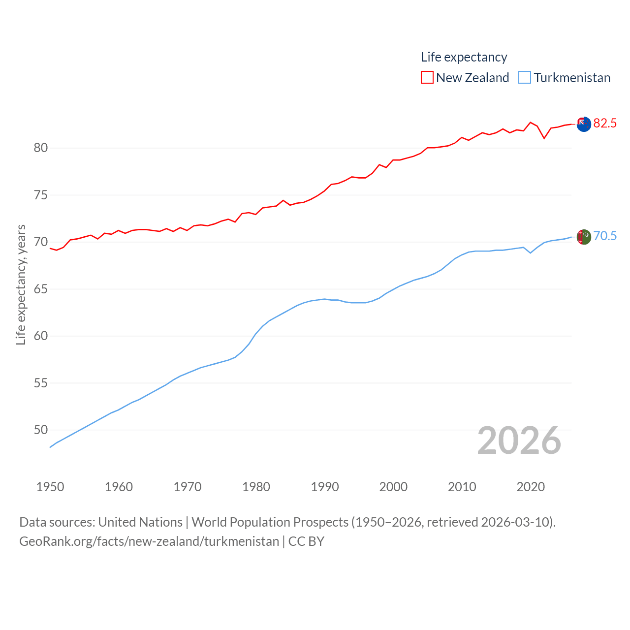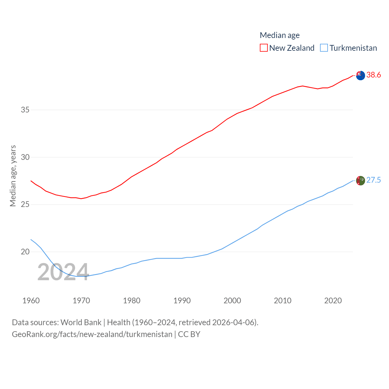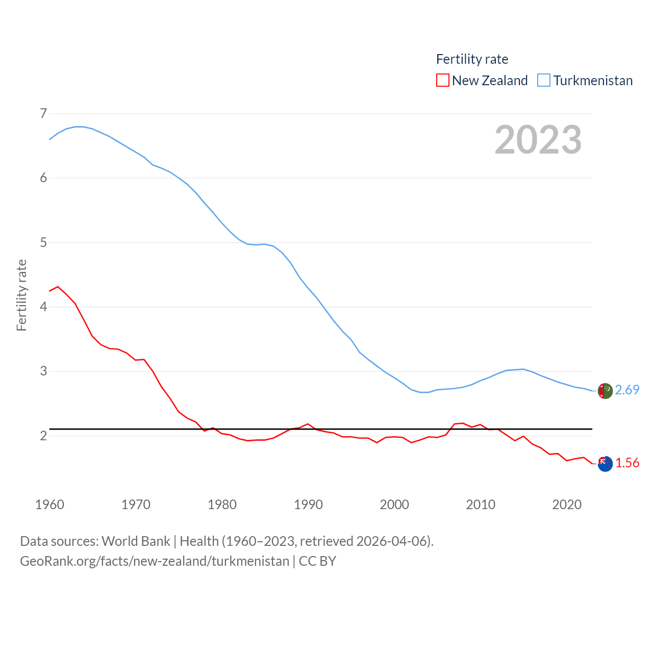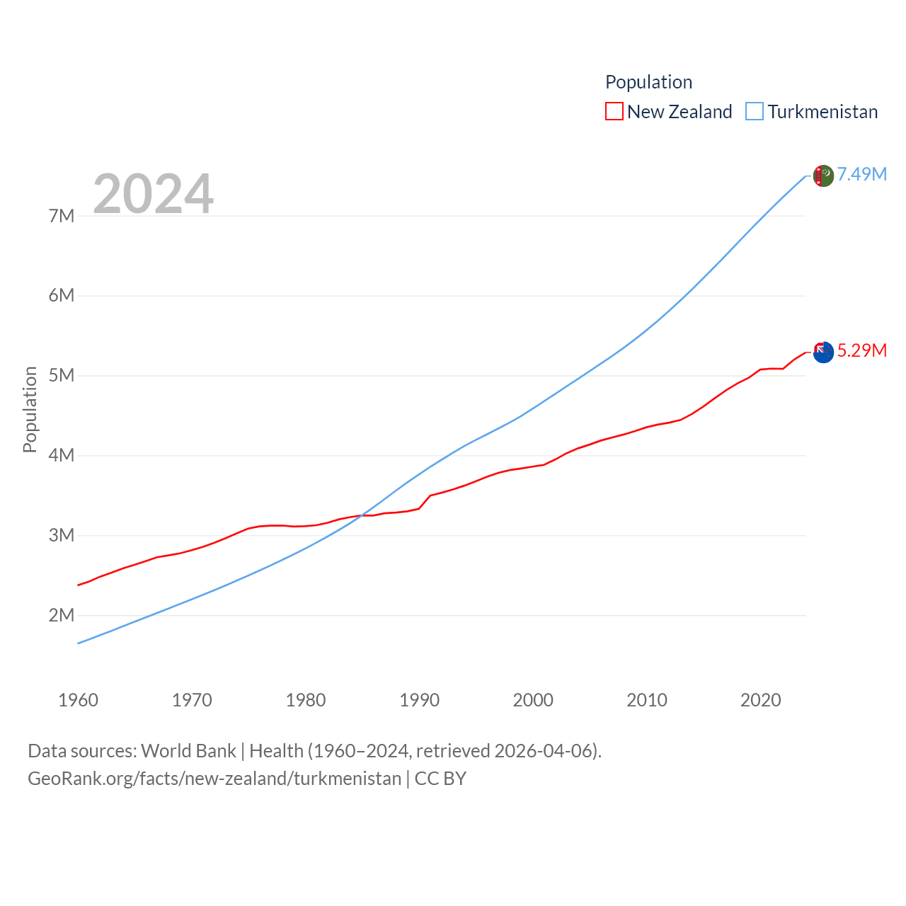 New Zealand has a population of 5.29M (ranked 123/197), compared with 7.49M in Turkmenistan (ranked 104/197). New Zealand's land area is 101,665 sq mi versus 181,441 sq mi for Turkmenistan (ranked 74th vs. 53rd).