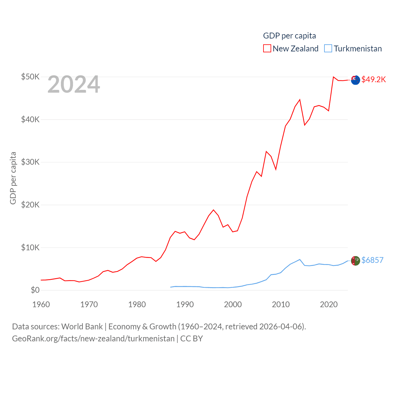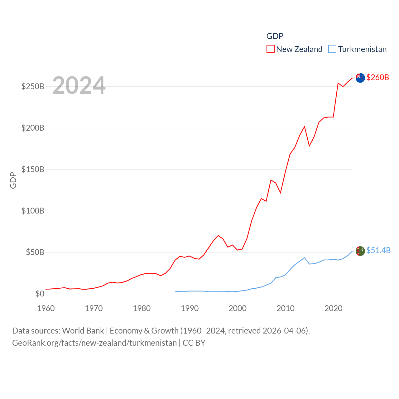 By GDP, New Zealand ranks 52/197 ($260B) and Turkmenistan ranks 92/197 ($51.4B). By GDP per capita, New Zealand ranks 26/197 ($49,205), while Turkmenistan ranks 104/197 ($6,857).