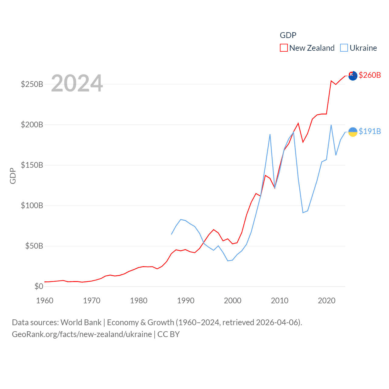 By GDP, New Zealand ranks 52/197 ($260B) and Ukraine ranks 57/197 ($191B). By GDP per capita, New Zealand ranks 26/197 ($49,205), while Ukraine ranks 120/197 ($5,038).