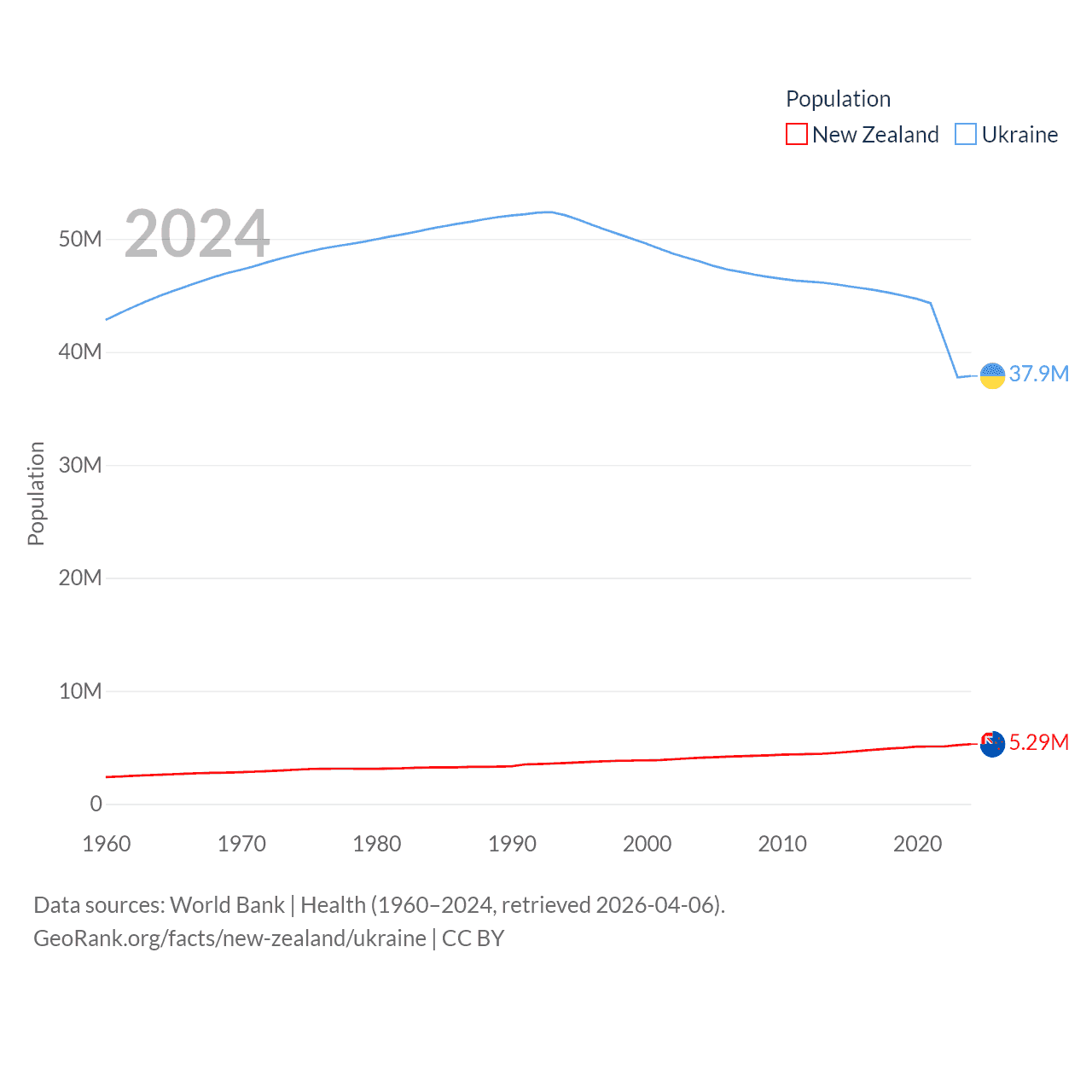 New Zealand has a population of 5.29M (ranked 123/197), compared with 37.9M in Ukraine (ranked 41/197). New Zealand's land area is 101,665 sq mi versus 223,708 sq mi for Ukraine (ranked 74th vs. 46th).