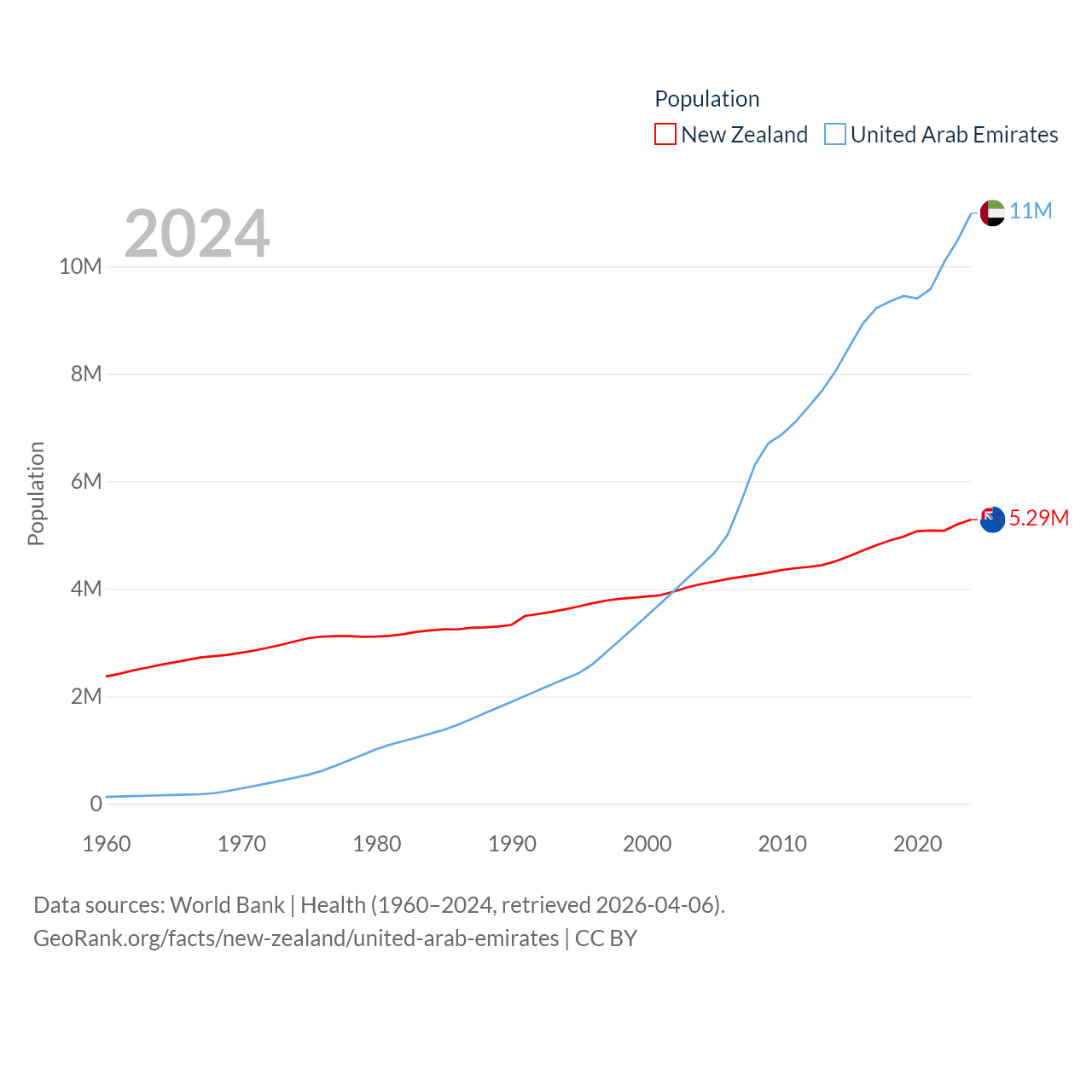 New Zealand has a population of 5.29M (ranked 123/197), compared with 11M in The United Arab Emirates (ranked 86/197). New Zealand's land area is 101,665 sq mi versus 27,421 sq mi for The United Arab Emirates (ranked 74th vs. 117th).