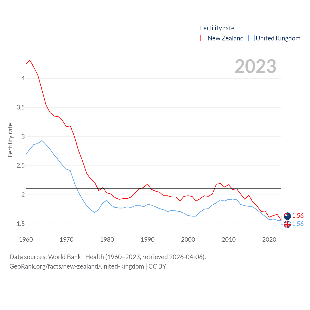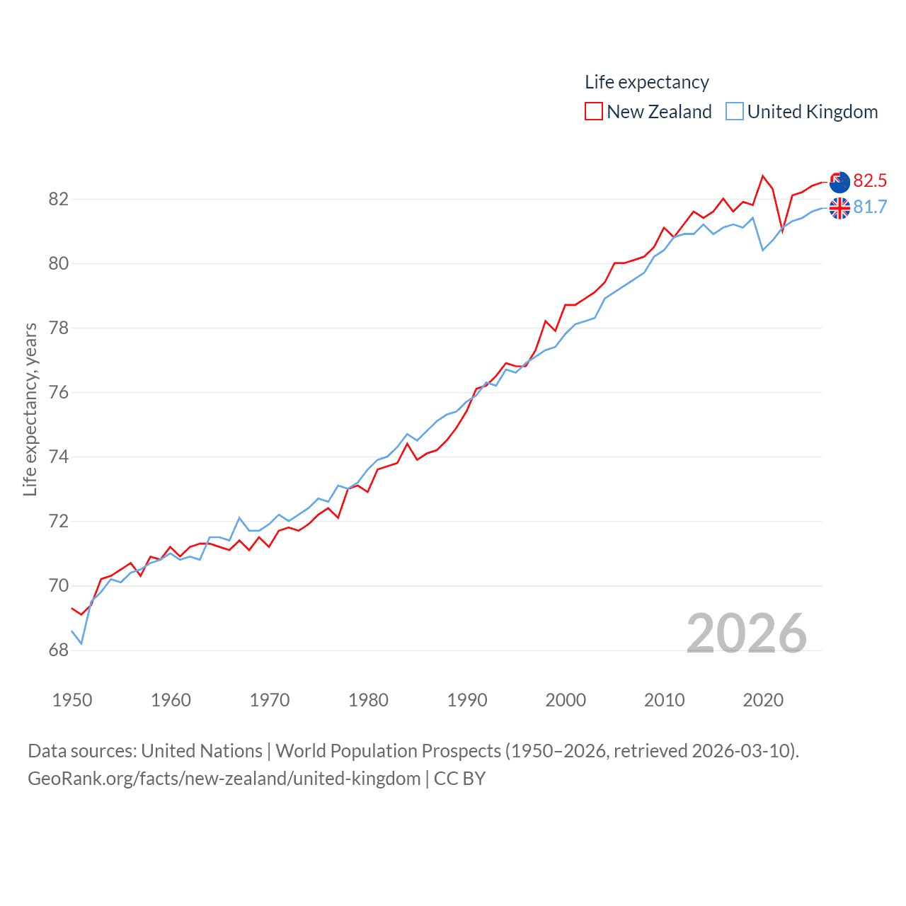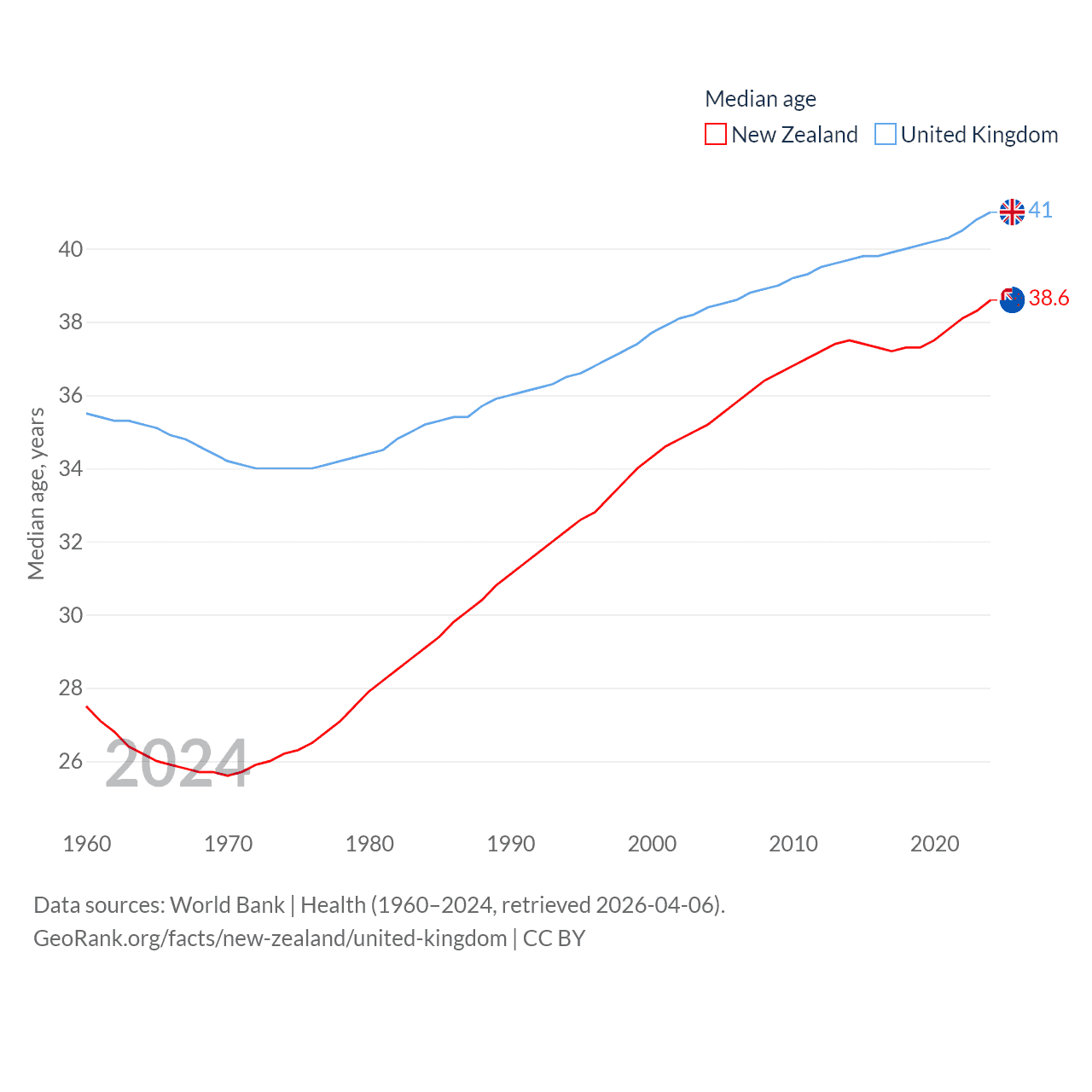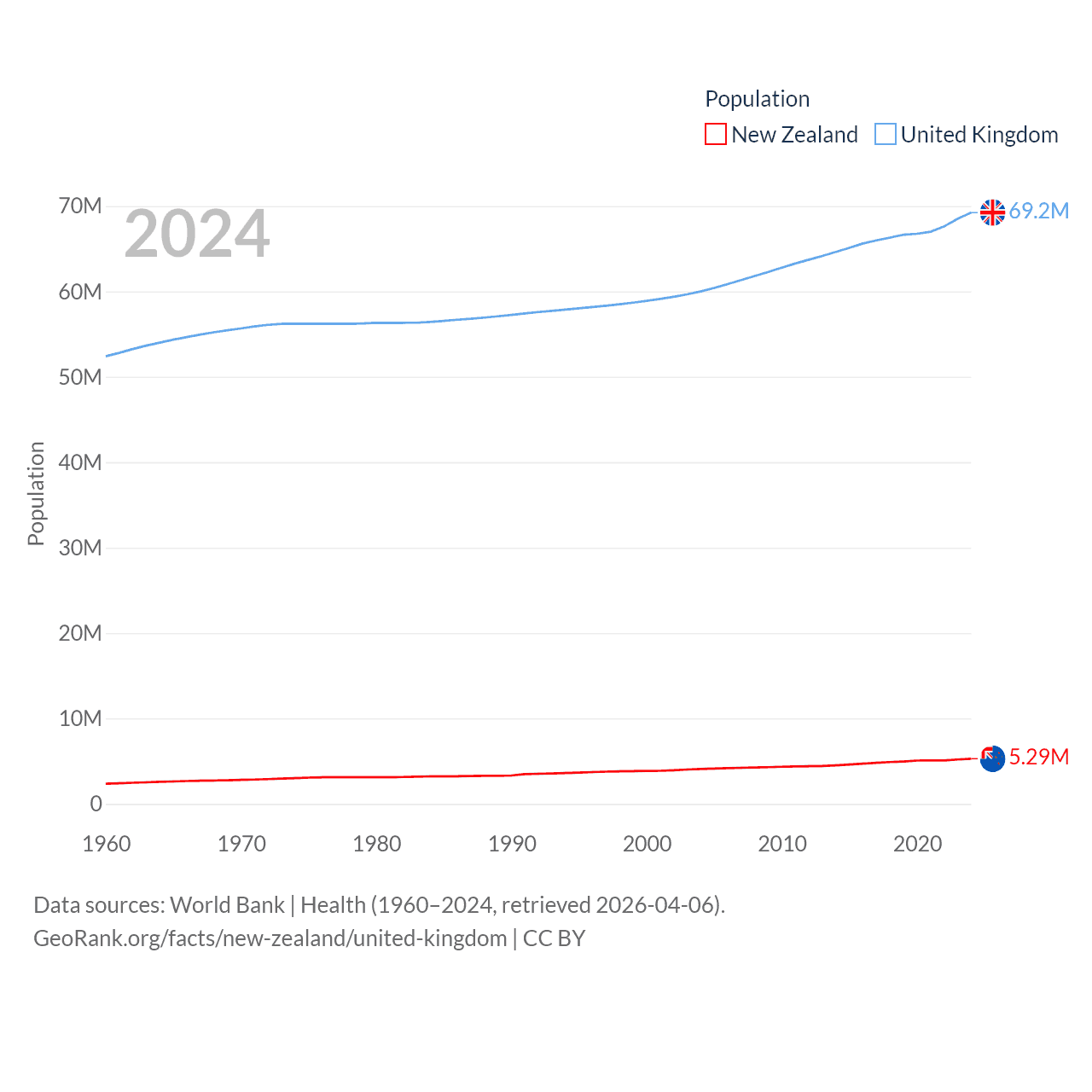 New Zealand has a population of 5.29M (ranked 123/197), compared with 69.2M in The United Kingdom (ranked 21/197). New Zealand's land area is 101,665 sq mi versus 93,410 sq mi for The United Kingdom (ranked 74th vs. 78th).