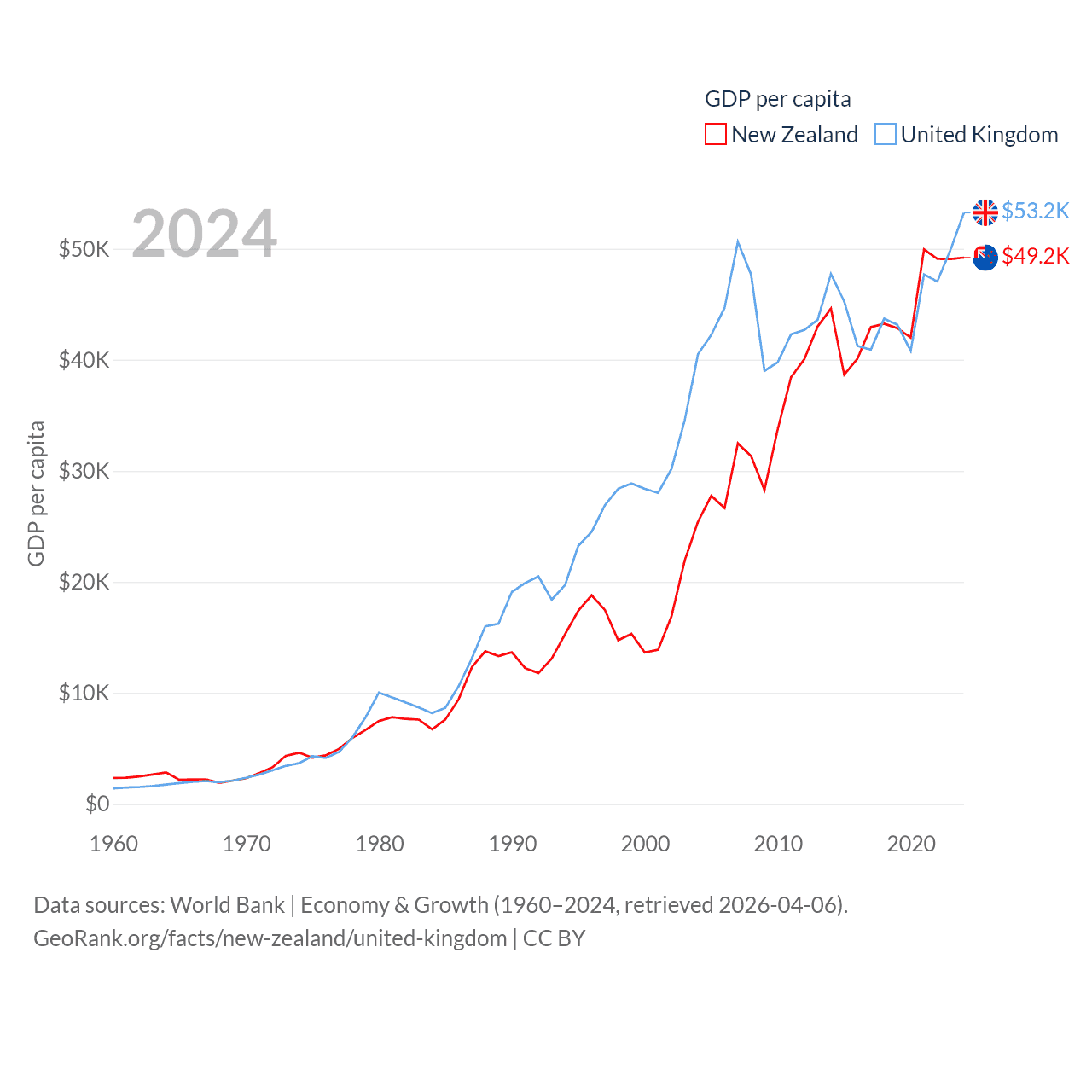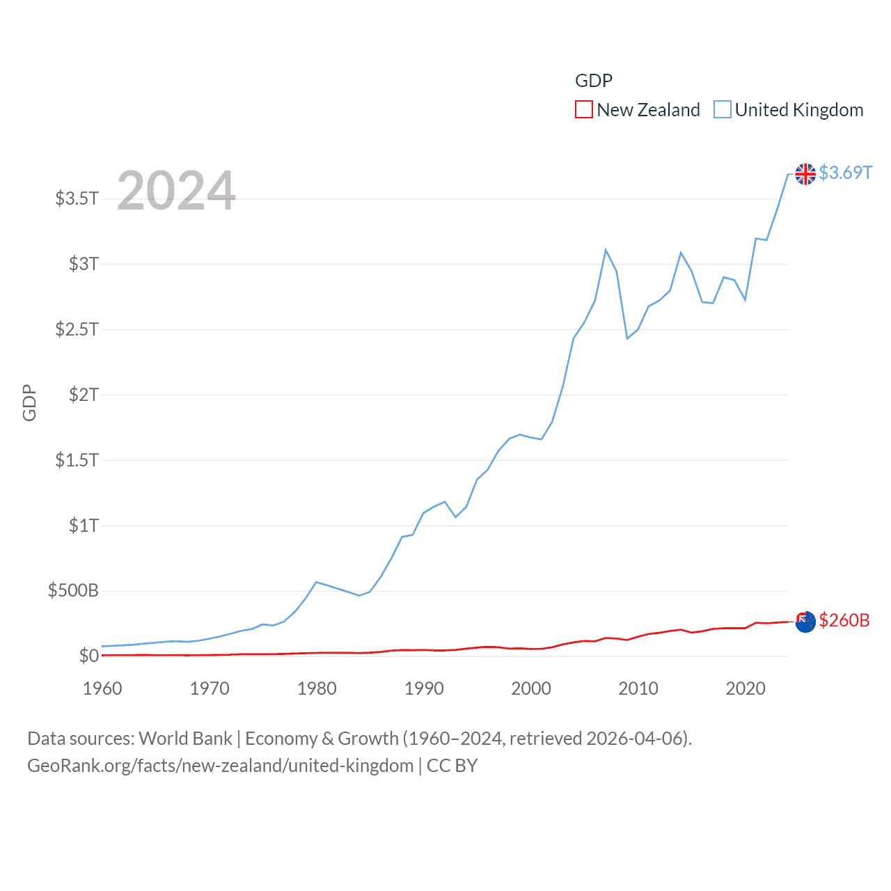 By GDP, New Zealand ranks 52/197 ($260B) and The United Kingdom ranks 6/197 ($3.69T). By GDP per capita, New Zealand ranks 26/197 ($49,205), while The United Kingdom ranks 22/197 ($53,246).