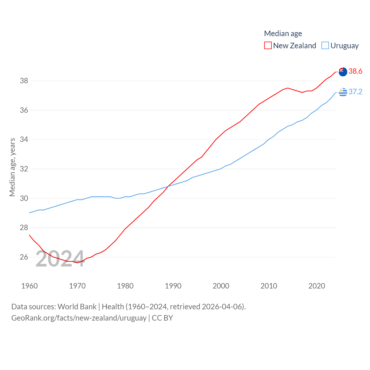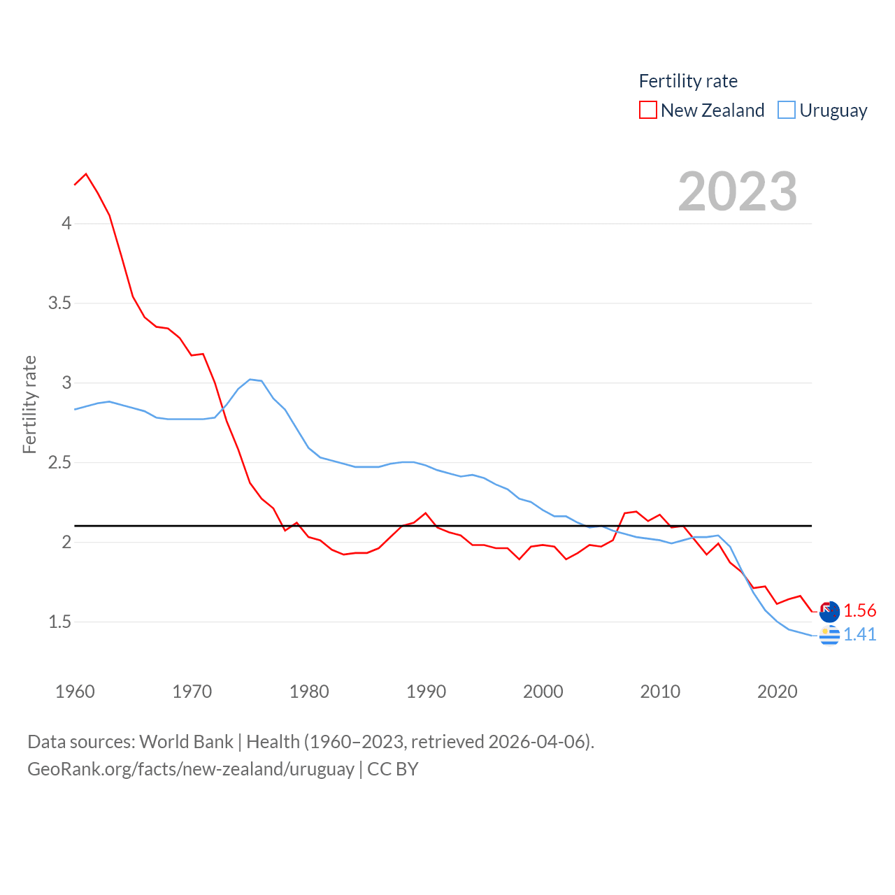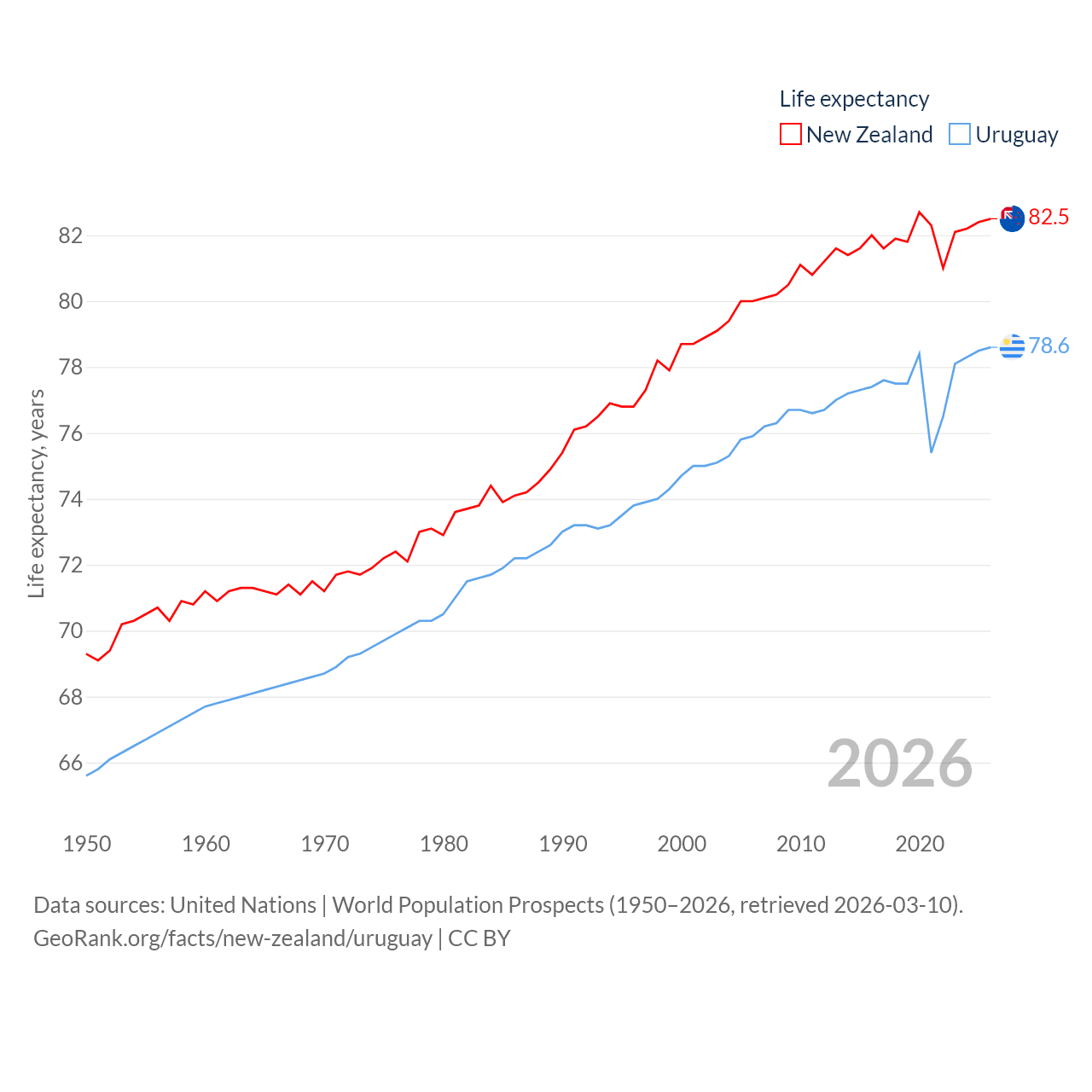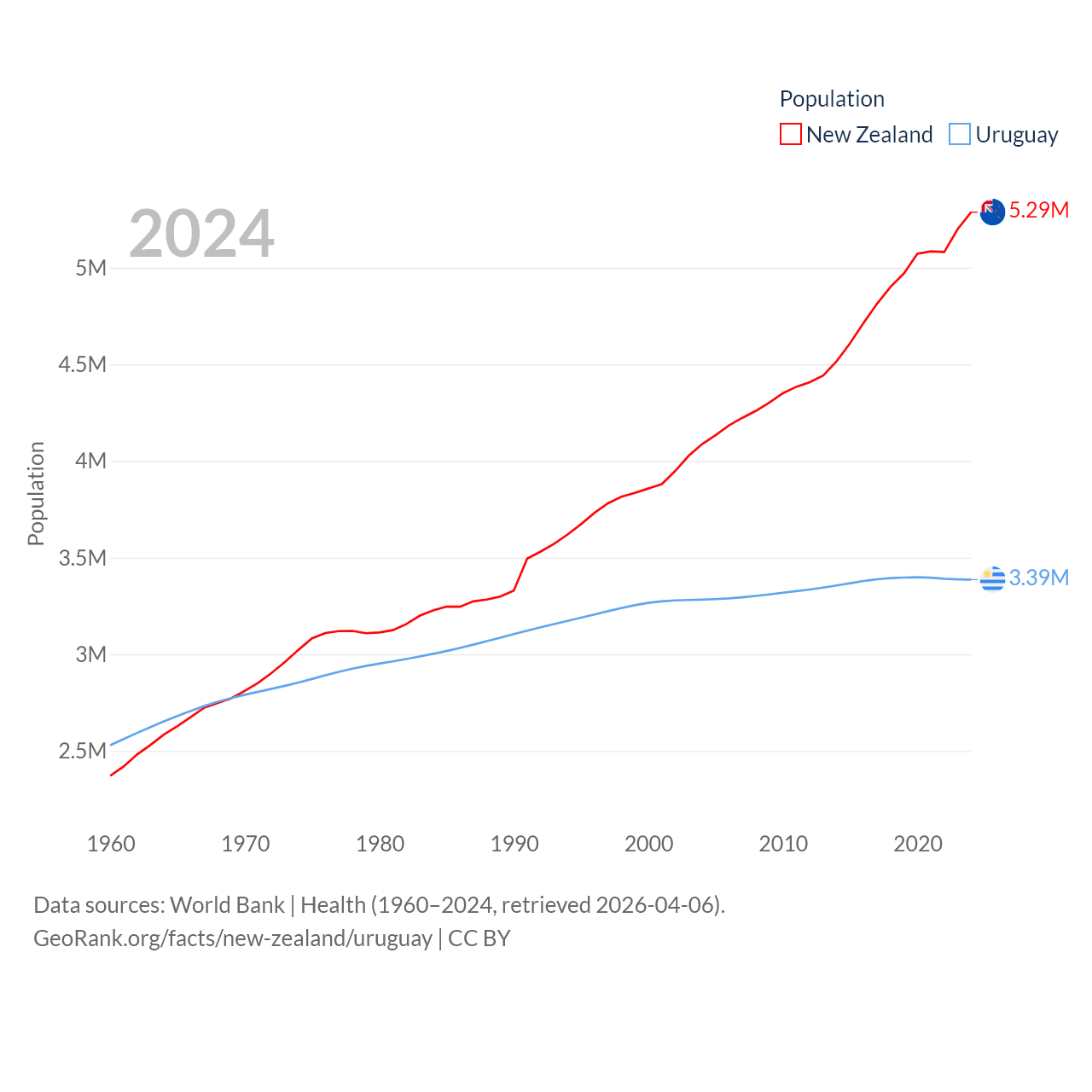 New Zealand has a population of 5.29M (ranked 123/197), compared with 3.39M in Uruguay (ranked 133/197). New Zealand's land area is 101,665 sq mi versus 67,576 sq mi for Uruguay (ranked 74th vs. 89th).