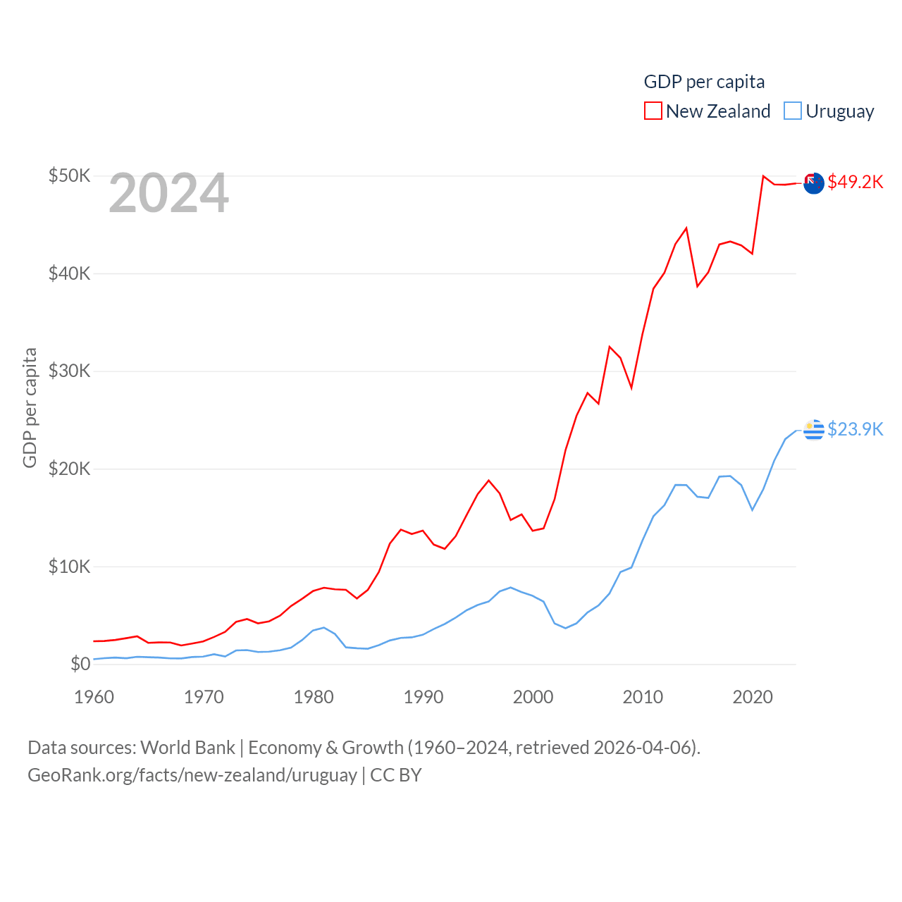 By GDP, New Zealand ranks 52/197 ($260B) and Uruguay ranks 81/197 ($81B). By GDP per capita, New Zealand ranks 26/197 ($49,205), while Uruguay ranks 52/197 ($23,907).