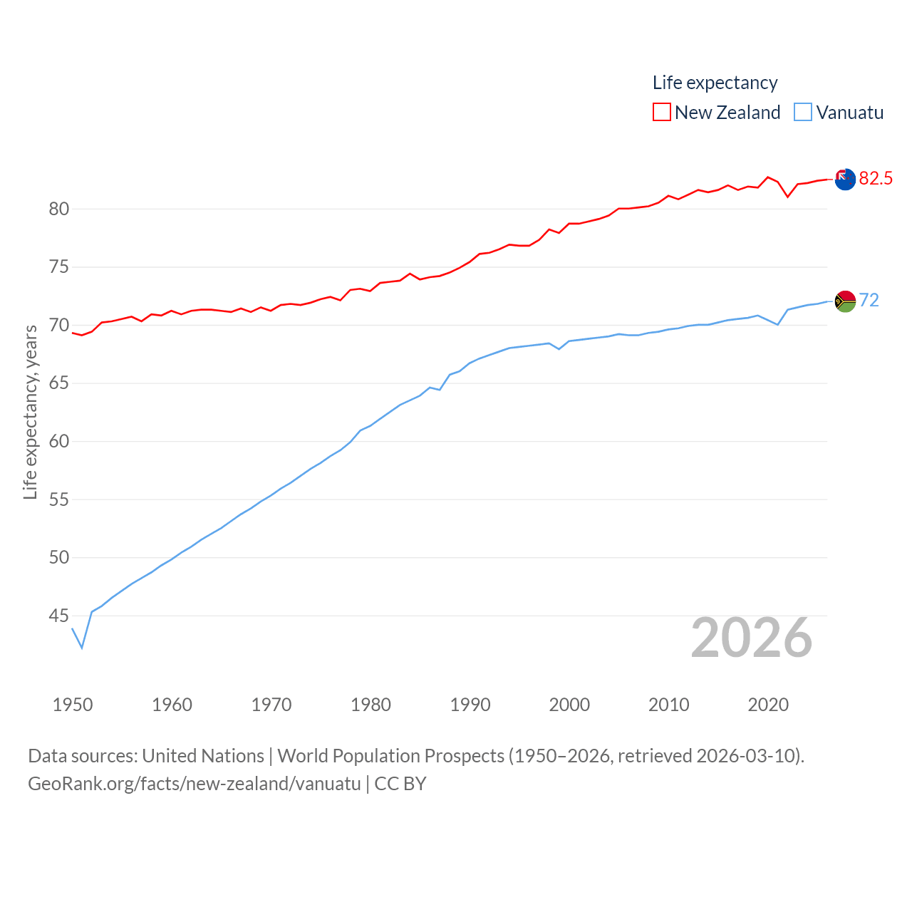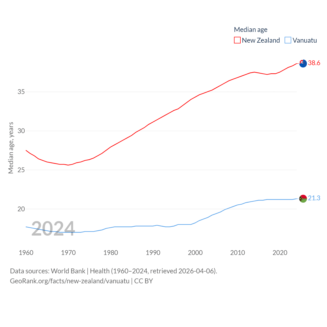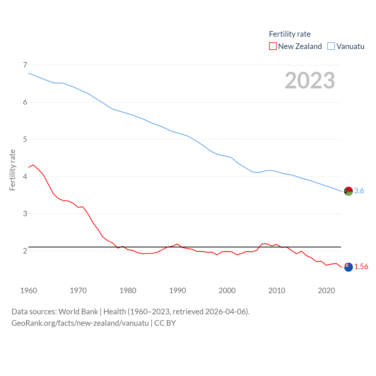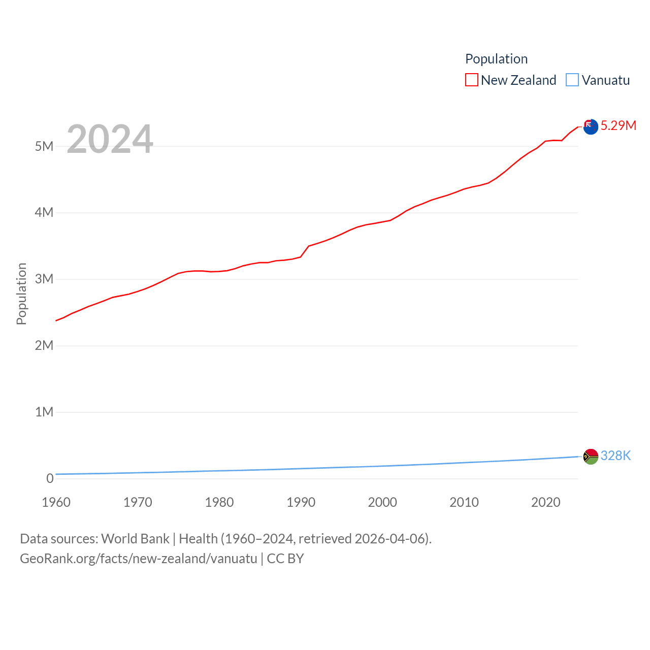 New Zealand has a population of 5.29M (ranked 123/197), compared with 328K in Vanuatu (ranked 174/197). New Zealand's land area is 101,665 sq mi versus 4,707 sq mi for Vanuatu (ranked 74th vs. 157th).