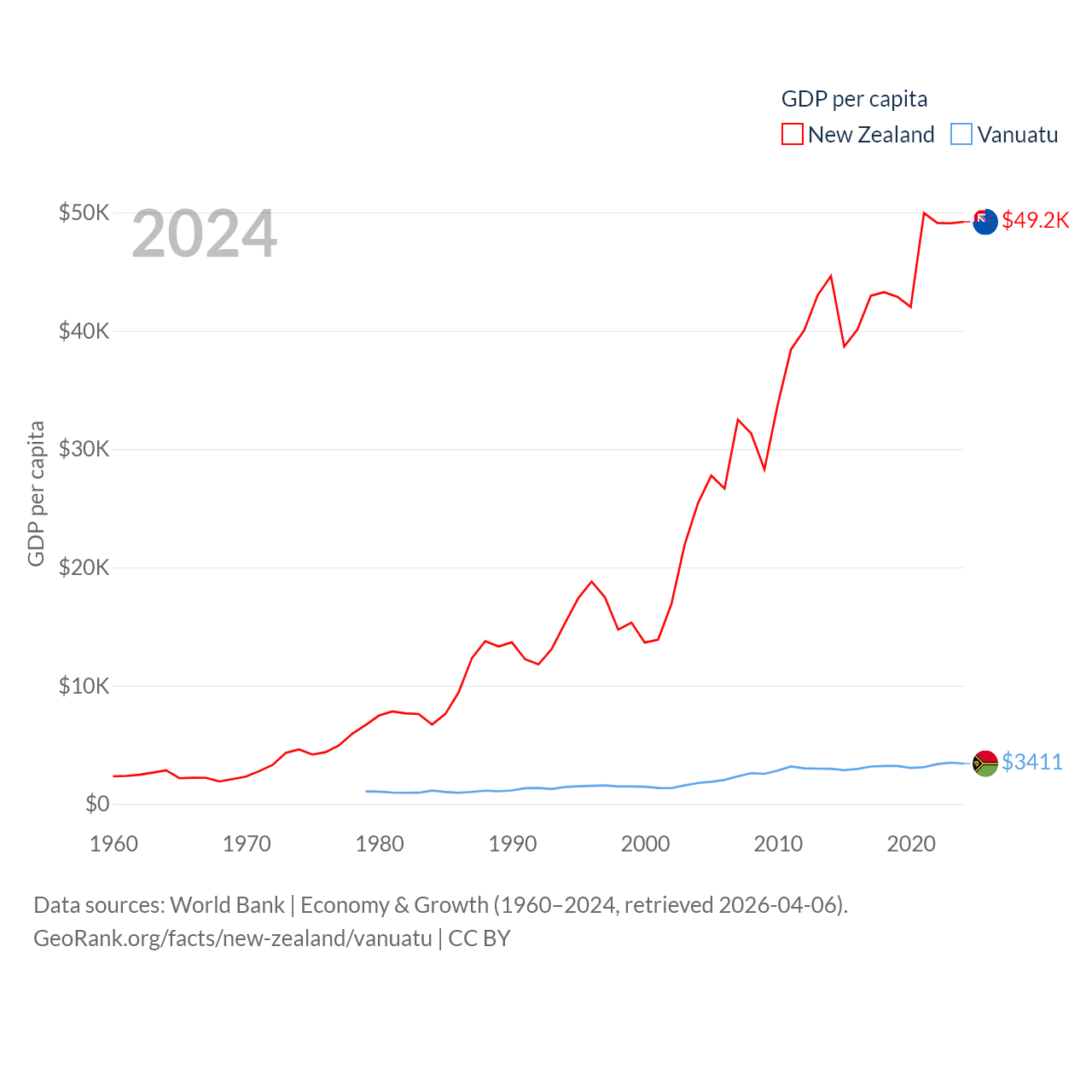 By GDP, New Zealand ranks 52/197 ($260B) and Vanuatu ranks 188/197 ($1.12B). By GDP per capita, New Zealand ranks 26/197 ($49,205), while Vanuatu ranks 137/197 ($3,411).