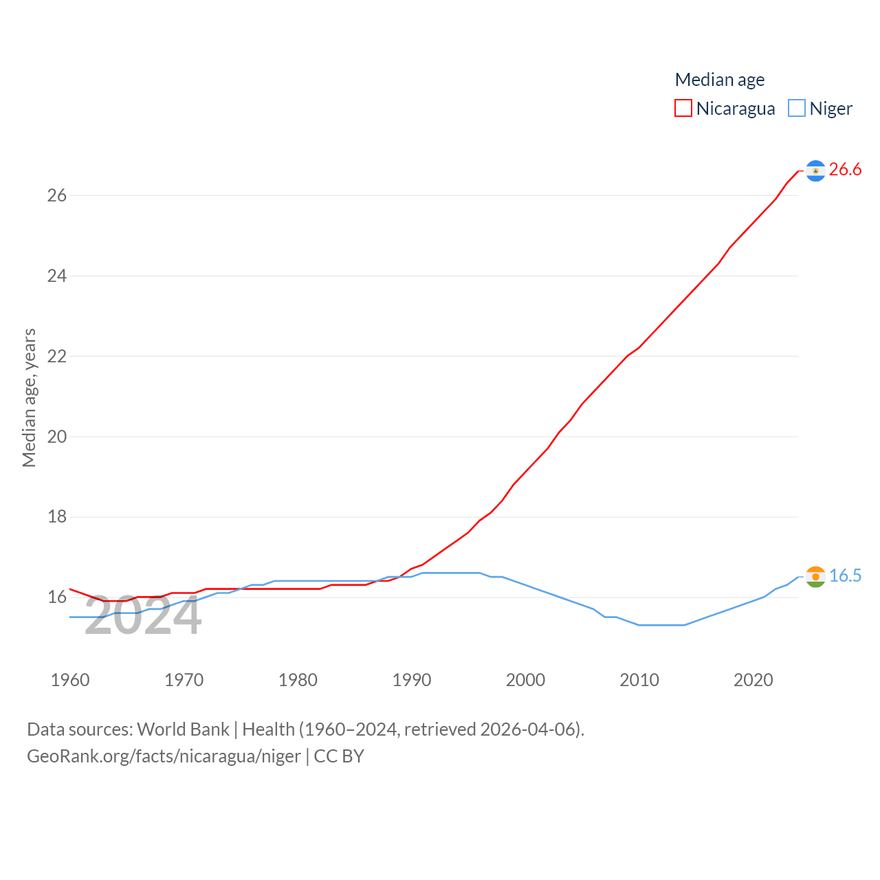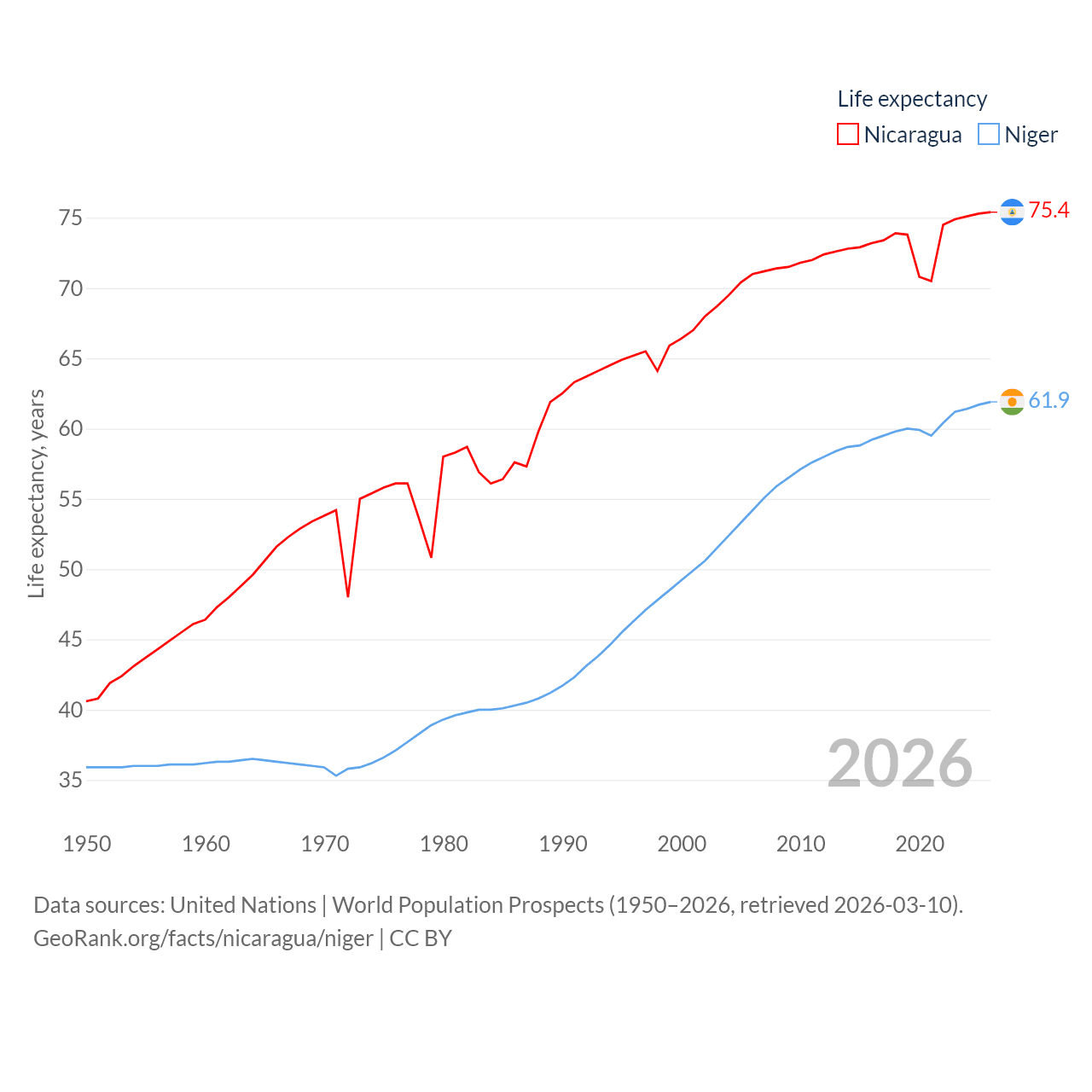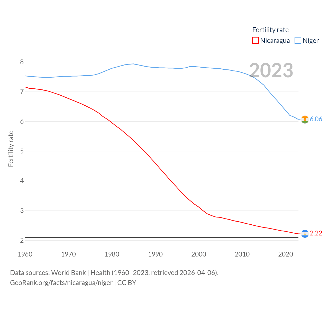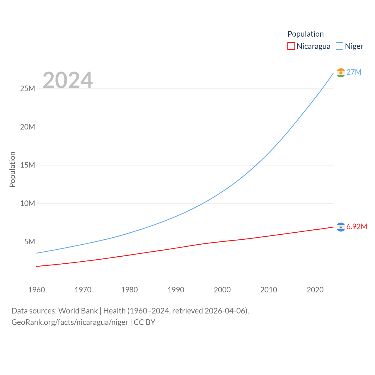 Nicaragua has a population of 6.92M (ranked 108/197), compared with 27M in Niger (ranked 55/197). Nicaragua's land area is 46,464 sq mi versus 489,076 sq mi for Niger (ranked 98th vs. 20th).