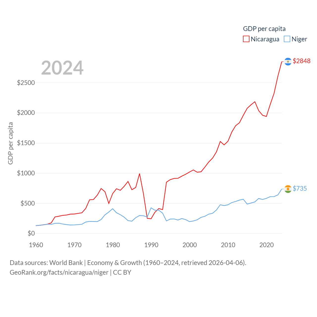 By GDP, Nicaragua ranks 131/197 ($19.7B) and Niger ranks 130/197 ($19.9B). By GDP per capita, Nicaragua ranks 141/197 ($2,848), while Niger ranks 187/197 ($735).