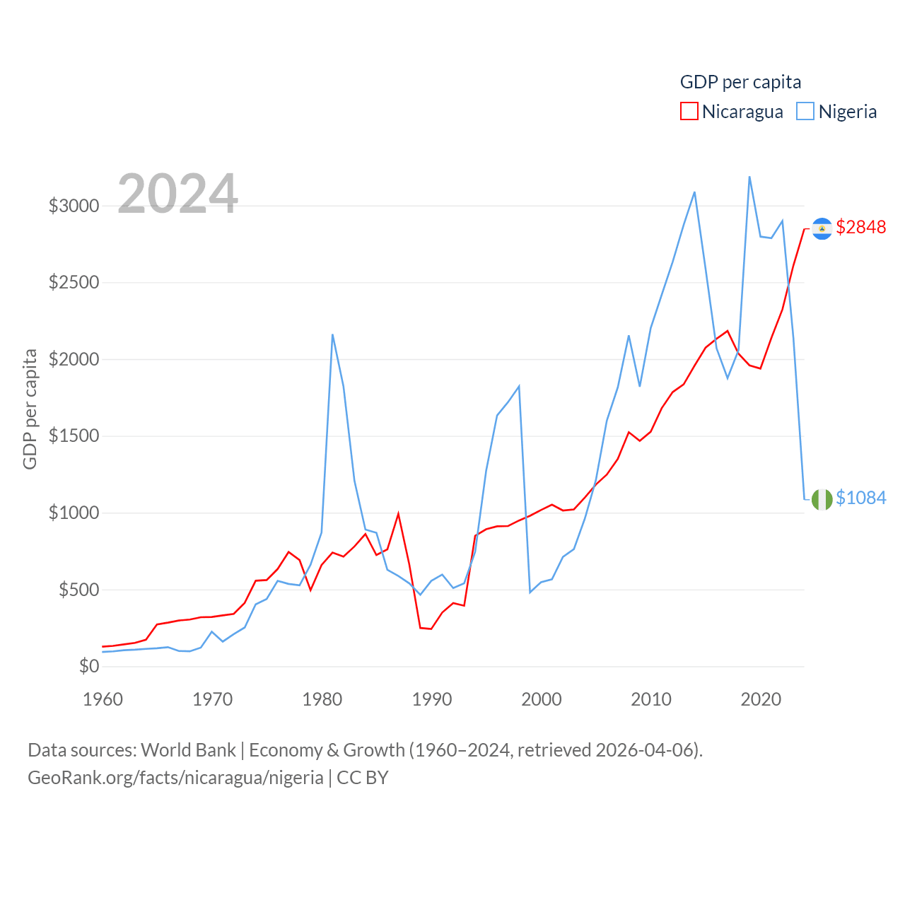By GDP, Nicaragua ranks 131/197 ($19.7B) and Nigeria ranks 54/197 ($252B). By GDP per capita, Nicaragua ranks 141/197 ($2,848), while Nigeria ranks 174/197 ($1,084).