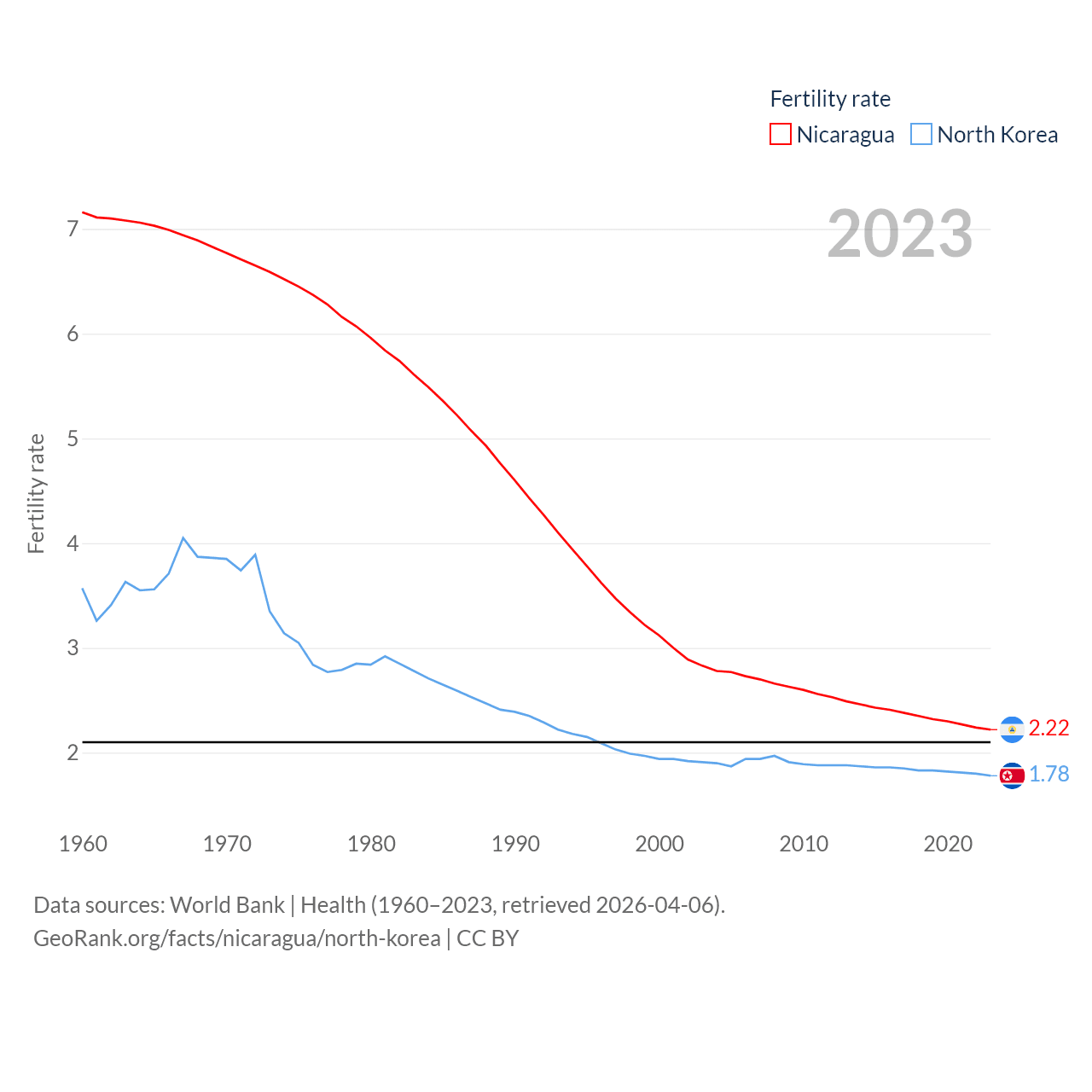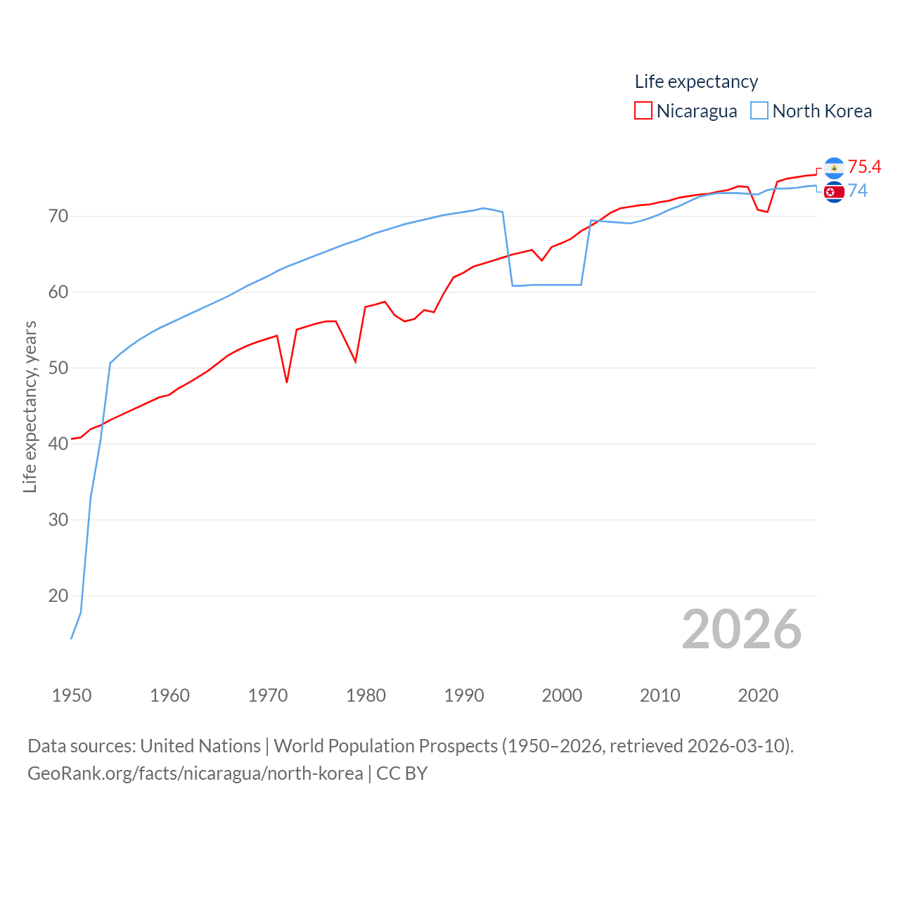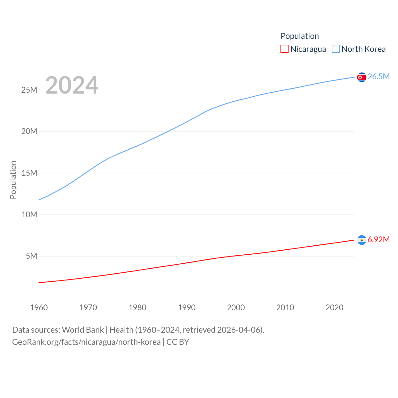 Nicaragua has a population of 6.92M (ranked 108/197), compared with 26.5M in North Korea (ranked 56/197). Nicaragua's land area is 46,464 sq mi versus 46,491 sq mi for North Korea (ranked 98th vs. 97th).